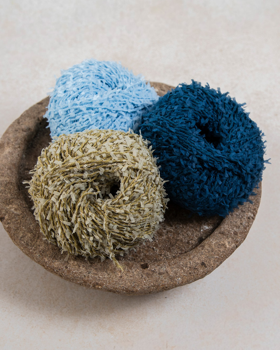 Effektgarn lavet af bomuldstråde med sammenflettede papirstrimler Garnet skaber farverige og legende designs med sin bløde følelse og livlige udtryk. Kombinationen giver en overraskende blød tekstur og en udtryksfuld, dynamisk overflade. Perfekt til utraditionelle designs, kreative detaljer og til alle, der elsker det specielle – moderne, let og helt trendy.