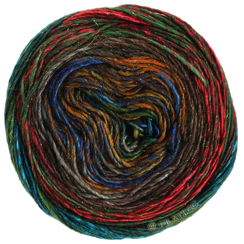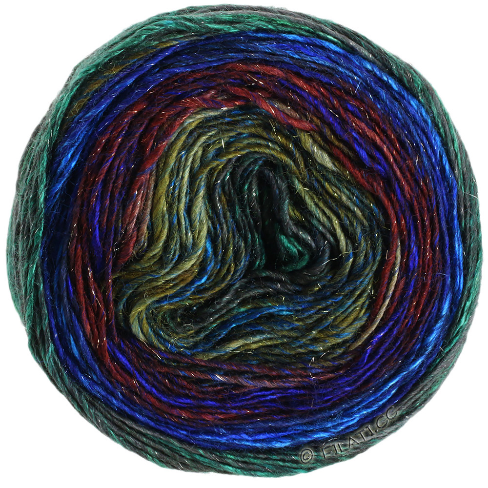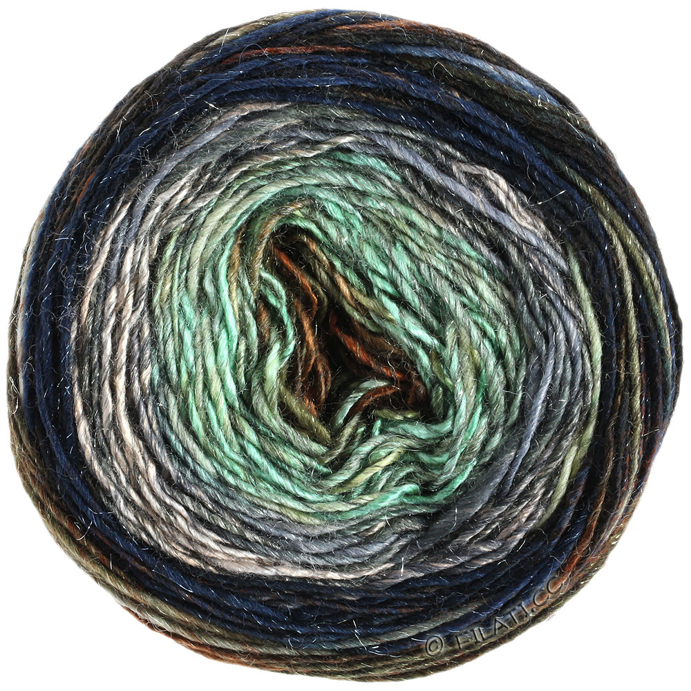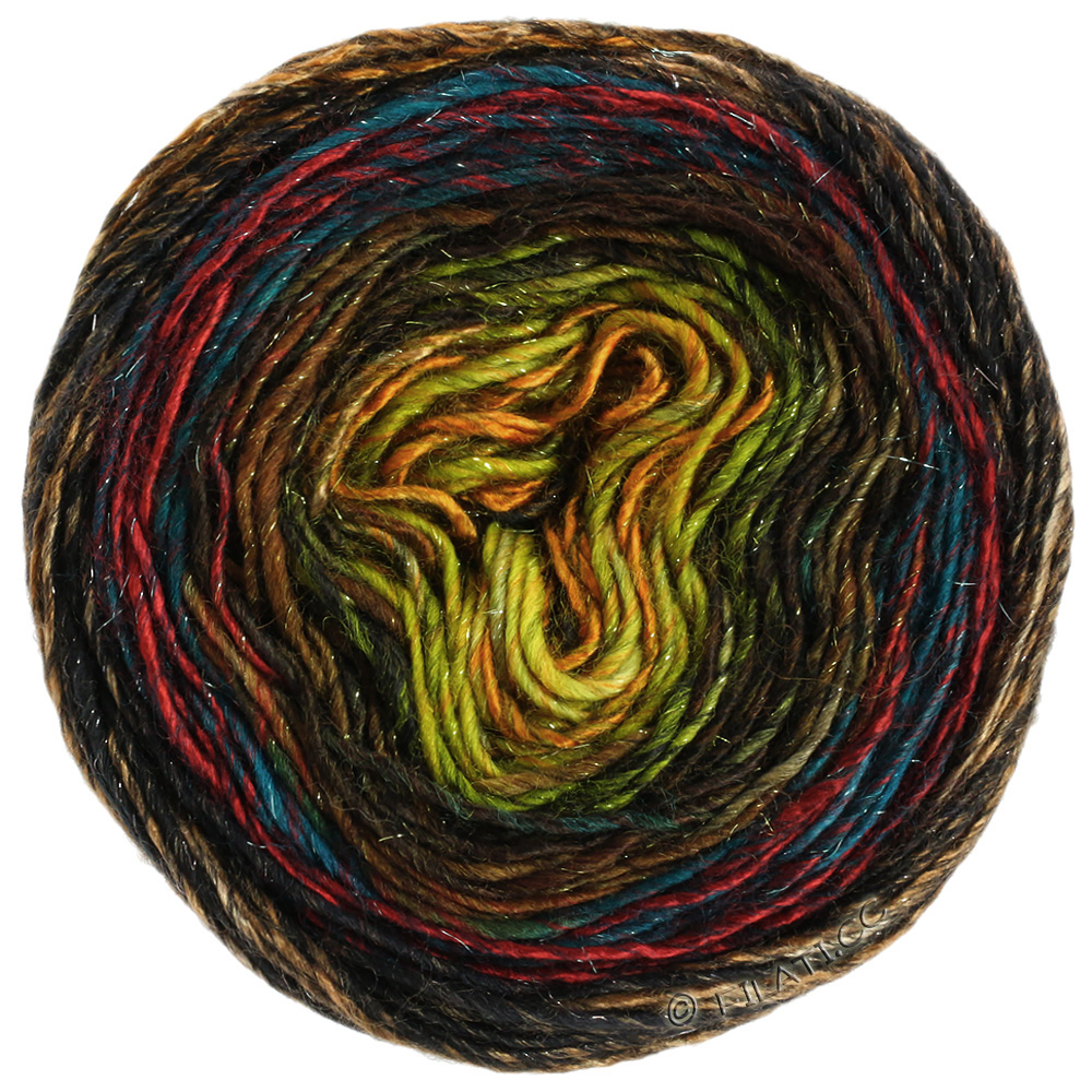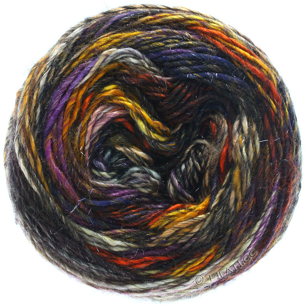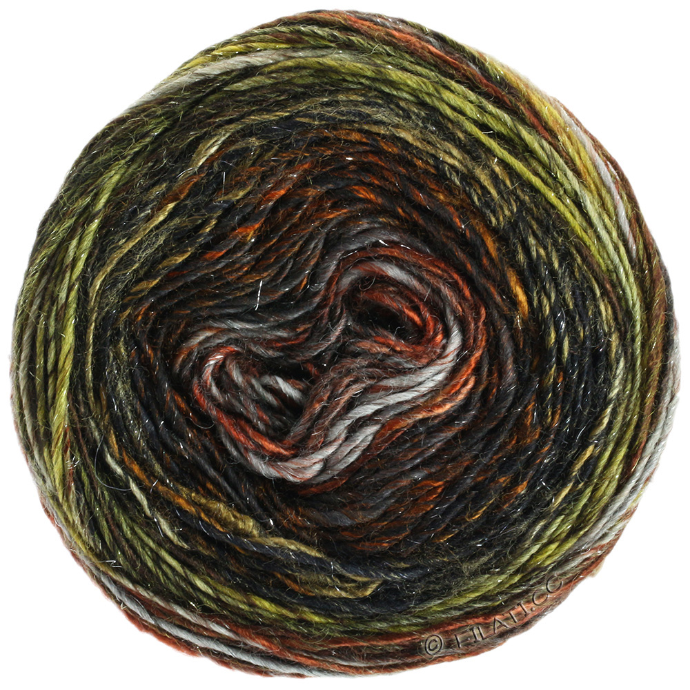 Flerfarvet trykt 1-tråds blandingsgarn med let glanseffekt, i 40% ren, merino uld.