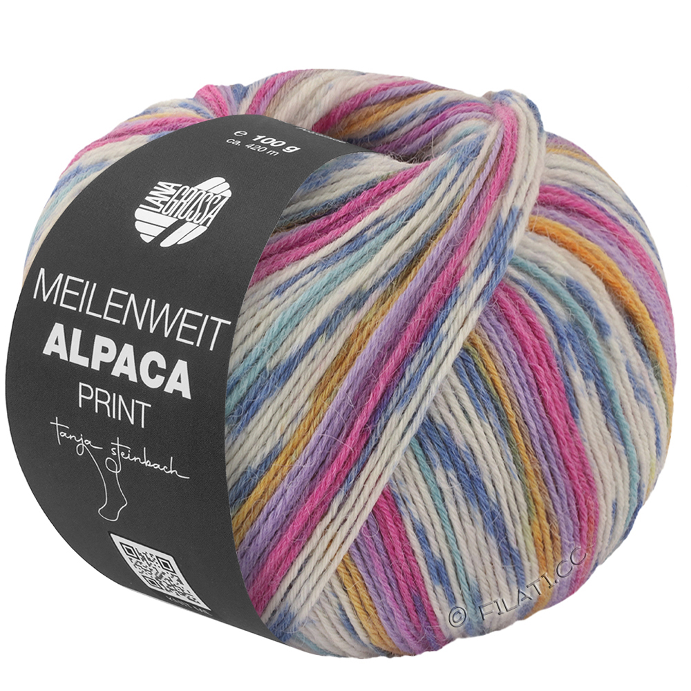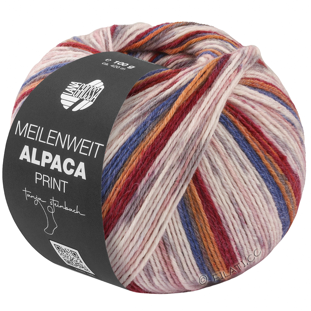 Lana Grossa Meilenweit Alpaka Print 6-trådet forener blødt, hyggeligt alpakagarn med stilfulde farveforløb. Det 6-trådede strømpegarn er særligt varmt, slidstærkt og behageligt mod huden.