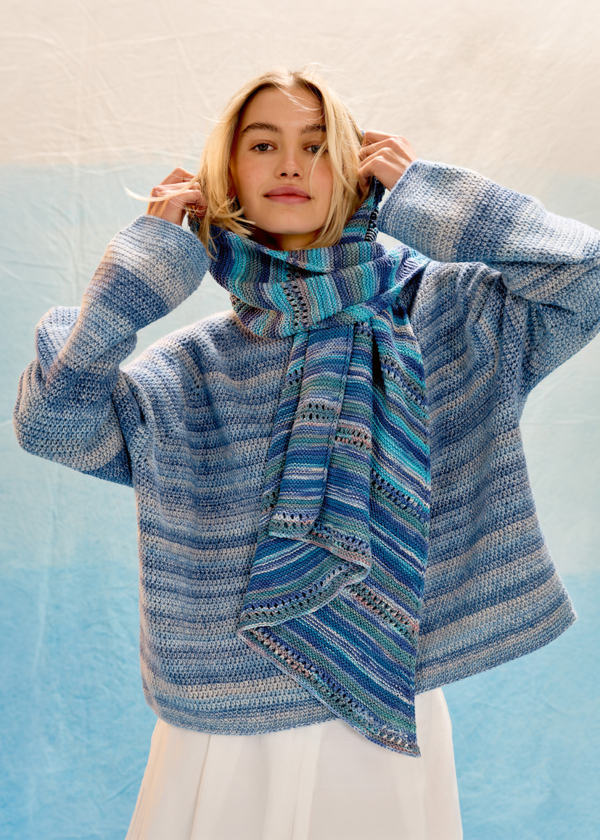 Lana Grossa-kvalitet „Gomitolo Alga“ (65 % bomull, 23 % viskose (bambus), 12 % seacell, løpelengde = ca 280 m/100 g): ca 3 nøster = ca 300 g hvit/lysblå/mørkblå/isblå/grå/tyrkis/ petrol/gammelrosa (farge 2024); pinner nr. 3.