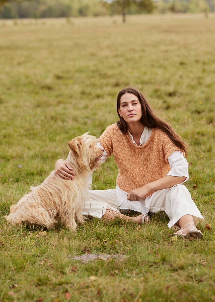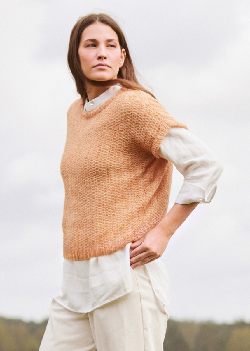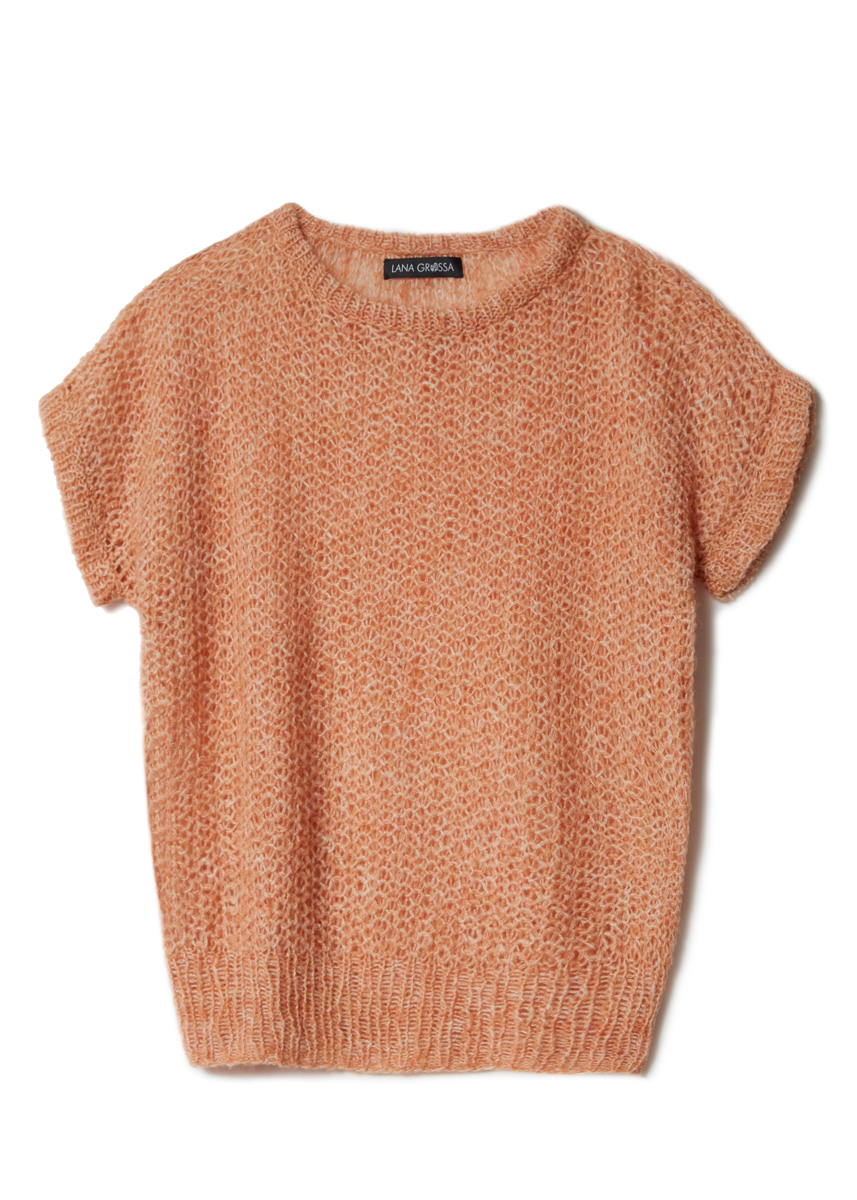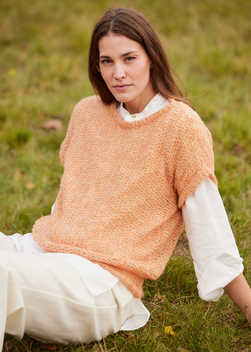 Lana Grossa-kvalitet “Bella” (35 % bomuld, 30 % nylon, 25 % alpaka (baby), 10 % ren ny uld (merino), løbelængde = ca. 250 m / 25 gr): ca. 100(125-125-150) gr fersken (fv 17), strikkepinde nr. 4½ og 6½, en kort rundpind nr. 4½.