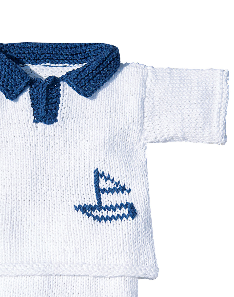 Lana Grossa-kvalitet ”Elastico” (96 % bomuld, 4 % polyester, løbelængde = ca. 160 m / 50 gr.): 100(100-150-150) gr hvid (fv 1) og 50 gr royal (fv 114), strikkepinde nr. 4, rundpind nr. 4, 40 cm, 1 knap med en diameter på 12 mm