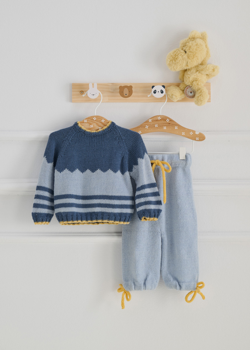 Lana Grossa Cool Wool Baby (100% ren ny ull (merino extrafine); løpelengde = 220 m/50 g): 100 (100/150/150) g lysblå (farge 208) og 50 g gul (farge 273); strømpepinner nr. 3 og 1 kort rundpinne nr. 3, 40 cm lang (alternativt en lengre rundpinne og arbeid med Magic Loop-metoden); maskemarkører [MM], gummibånd 45 (50/55/60) cm langt, 3 cm bredt.