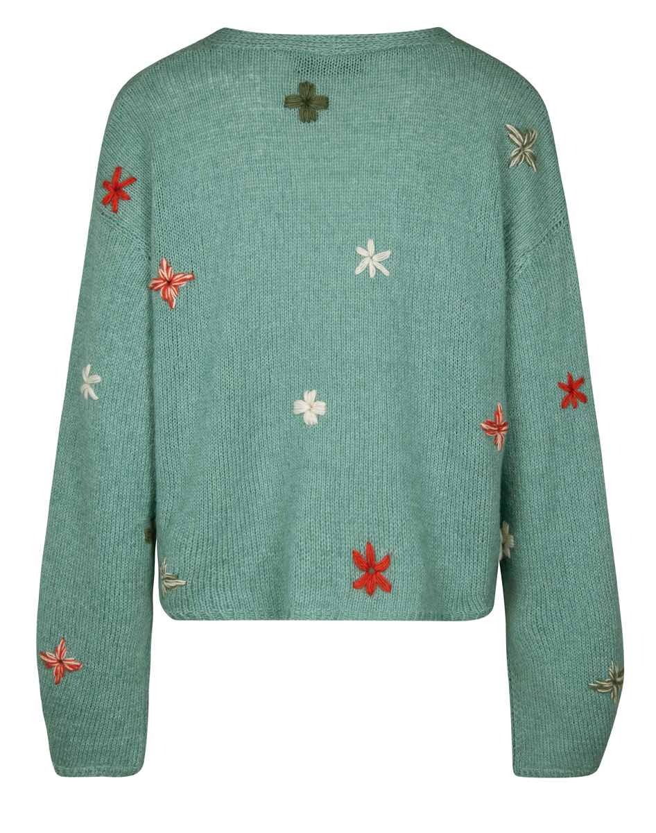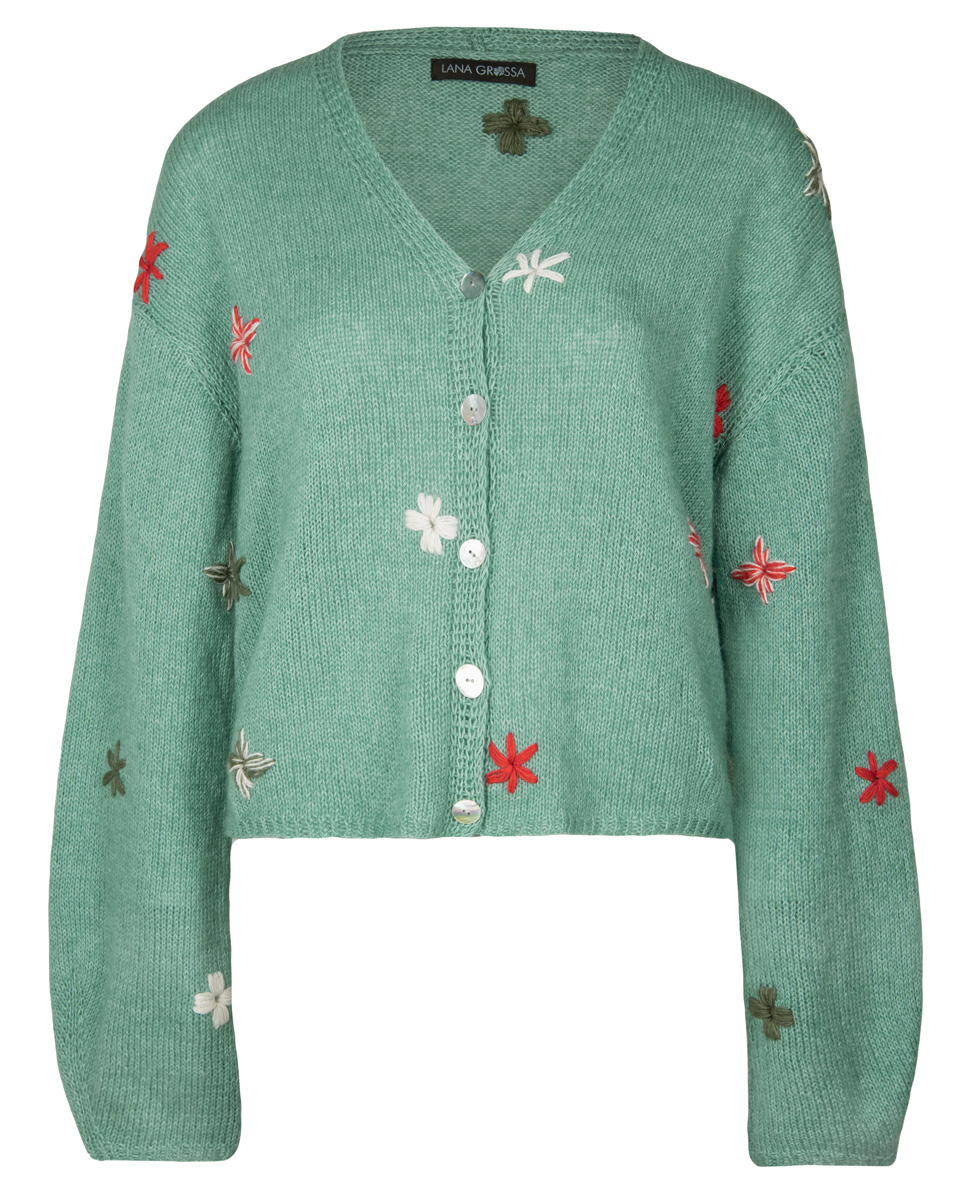 Lana Grossa-kvalitet „Allora” (76 % bomull, 14 % ren ny ull (merino superfin), 10 % (baby) alpacka, löplängd = ca. 300 m/50 g): ca. 250 (300) g turkos (färg 5) och ca. 50 g var i mörk grön (färg 4), pärlvit (färg 13) och röd (färg 18); stickor nr. 3,5, 1 ullnål von Lana Grossa; 5 naturfärgade 2-hål pärlemorknappar, ø 18 mm.