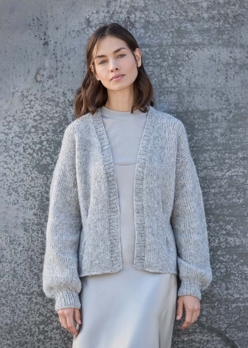 Lana Grossa-kvalitet „Alpaca Air II“ (50 % alpakka (baby), 27 % polyamid, 14 % bomull, 9 % ren ny ull (merino ), løpelengde = ca 140 m/50 g): 250 (300 - 300 - 350) g lysgrå (farge 10); kort og lang rundpinne nr. 4,5 og 5; 1 heklenål nr. 5; strømpepinner nr. 4,5; 1 butt stoppenål til ull.