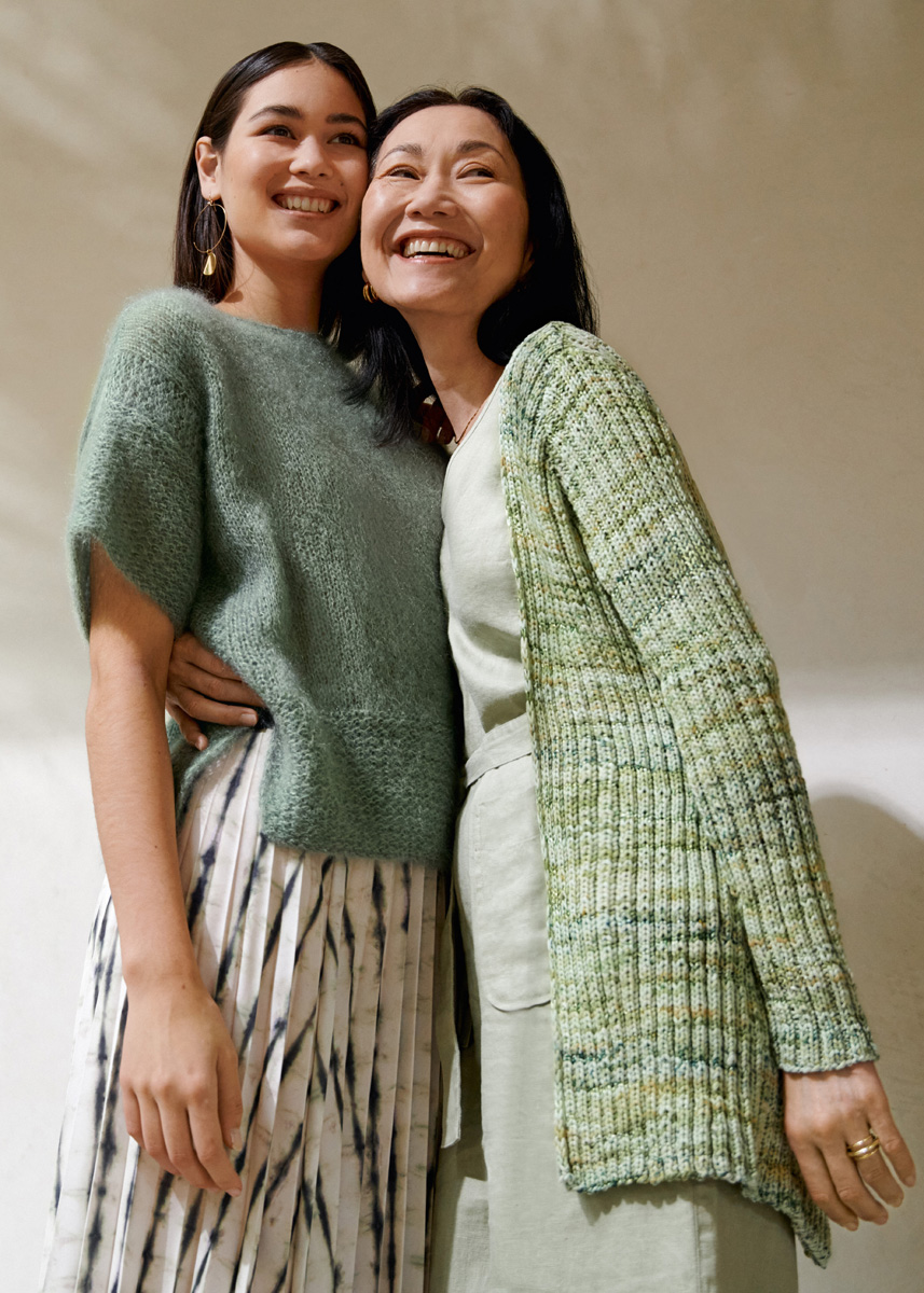 Lana Grossa-kvalitet „Ecco” (65 % bomull, 23 % silke, 12 % viskos, löplängd = ca. 120 m/50 g): ca. 600 (650 - 700) g mjukgrön/ljusgrön/gulgrön/mossgrön/ljusorange (färg 103); stickor nr. 4,5, 1 virknål nr. 4.