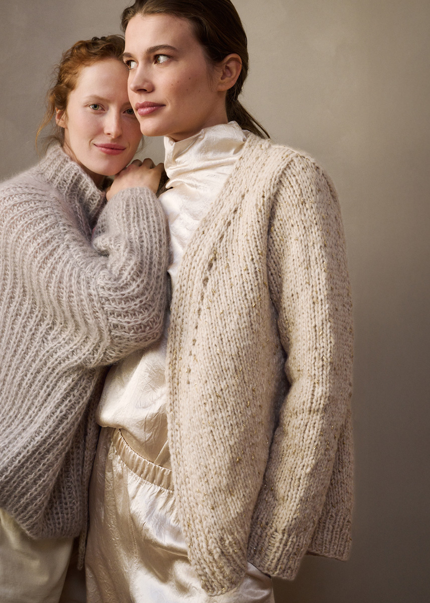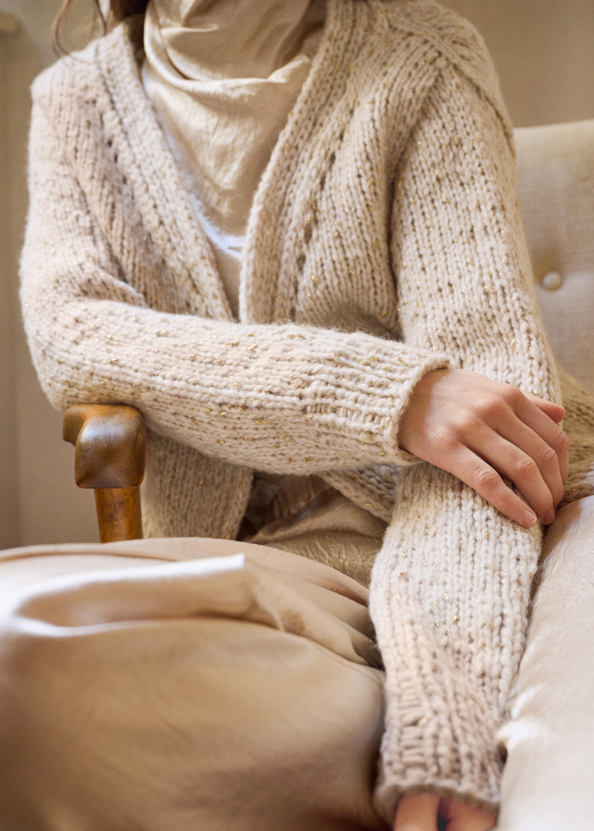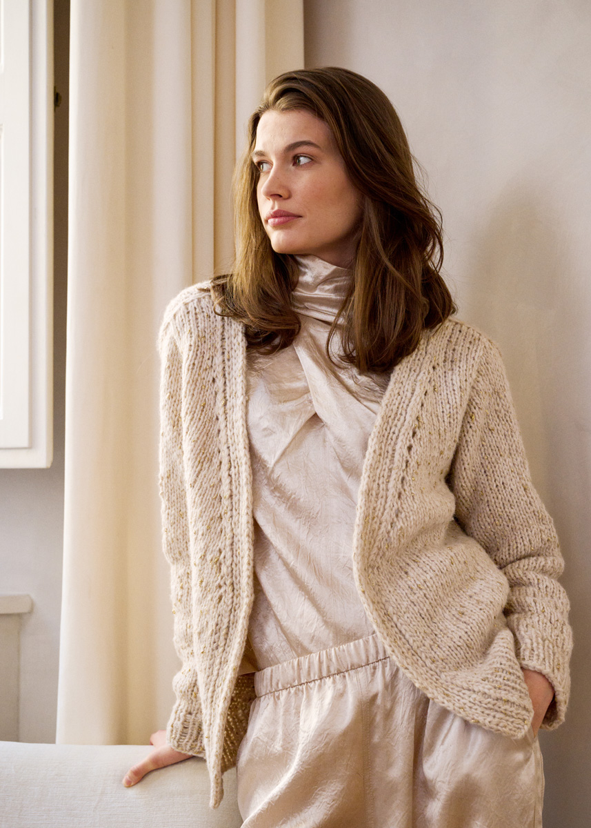 Lana Grossa-kvalitet ”Lucciola” (29% polyamid, 24% ren ny uld (fin merino), 22% viskose, 20% alpaka (baby), 5% metalliske fibre, løbelængde = ca. 130 m / 50 gr.): ca. 550 (600 - 650 – 700) gr creme (fv 7), lange rundpinde nr. 6, 7 og 9, kort rundpind nr. 9, strømpepinde nr. 7