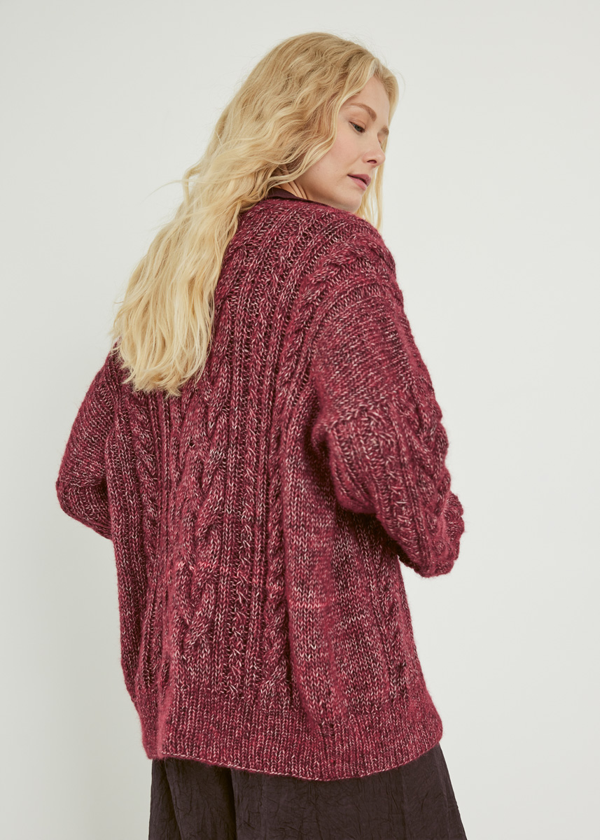 Lana Grossa Natural Alpaca Pelo (63 % bomuld, 31 % alpaka (baby), 6 % ren ny uld (merino); løbelængde = 125 m / 50 g): 500 (550 / 600 / 650) g bordeaux meleret (fv 30); rundpinde nr. 4 og 6, 80 - 100 cm (arb med mindre omkreds strikkes med Magic-Loop-metoden eller en ekstra kort rundpind nr. 4); snoningspind.