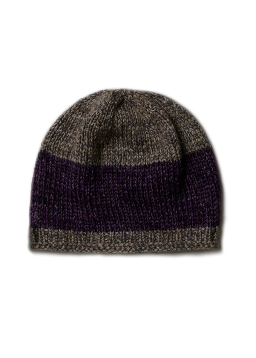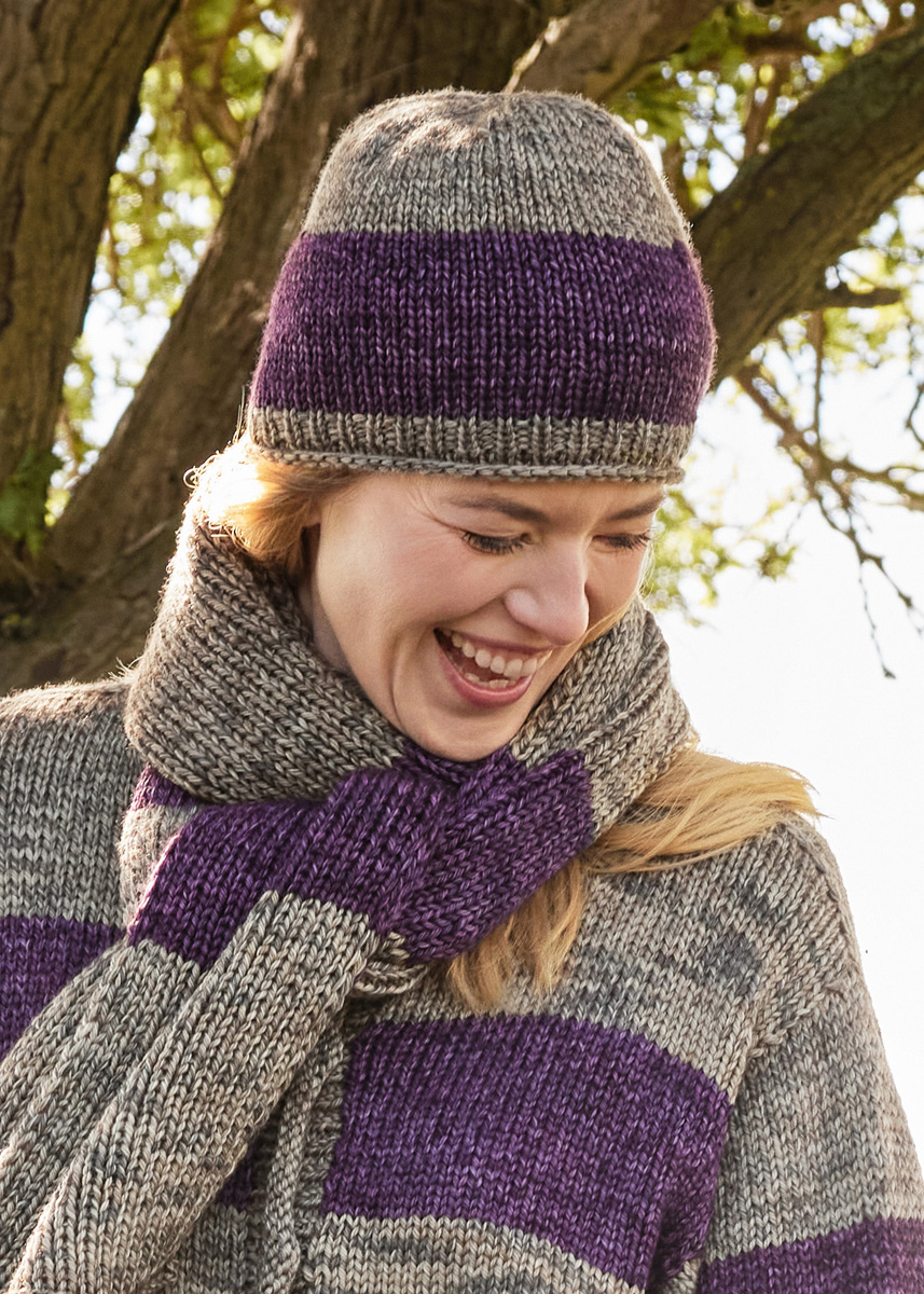 Materiale: Lana Grossa Vintage Chunky (100% ren ny uld (ekstrafin merino), LL = ca. 80 m/50 g), 50 g i antikviolet/aubergine (farve 8) og 50 g i beige/khaki (farve 1). Strømpepinde størrelse 5 og 6 mm.
