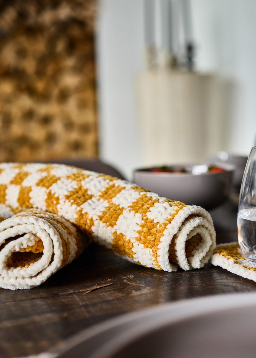 Lana Grossa-kvalitet „The Look Fine” (100 % polyester, løpelengde = ca. 100 m/50 g): hver ca. 200 g creme (farge 102) og rapsgul (farge 128); 1 heklenål nr. 4,5.