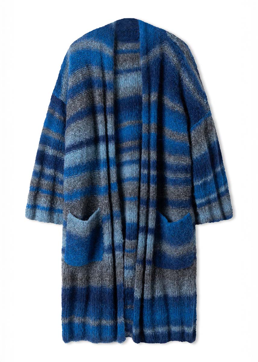 Lana Grossa Gigante (70% alpakka (fein), 30% polyamid, løpelengde = ca. 300 m/100 g), 500 (600) g i mørk-/nattblå/gråblå/grå (farge 7); strikkepinne nr. 7; 2 hjelpepinne til hvilende m.