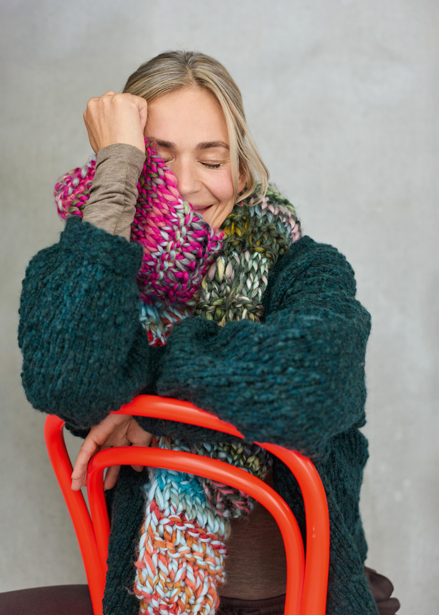 Lana Grossa-kvalitet „Dolce” (100 % ren ny ull (merino basolan), løpelengde = ca. 50 m/100 g): ca. 200 g pink/rosa/ mintgrønn/oliven/sennep (farge 5) og ca. 100 g hver i mosegrønn/dusrosa/mintgrønn/oliven/sennep (farge 4) og mint/ rød/lyspetrol/rost (farge 8); pinner nr. 12. Tips: Strikk alltid hele nøstet i én farge ferdig før du begynner med en ny farge. Fargeskiftet skal alltid gjøres ved slutten av p, ikke midt i.
