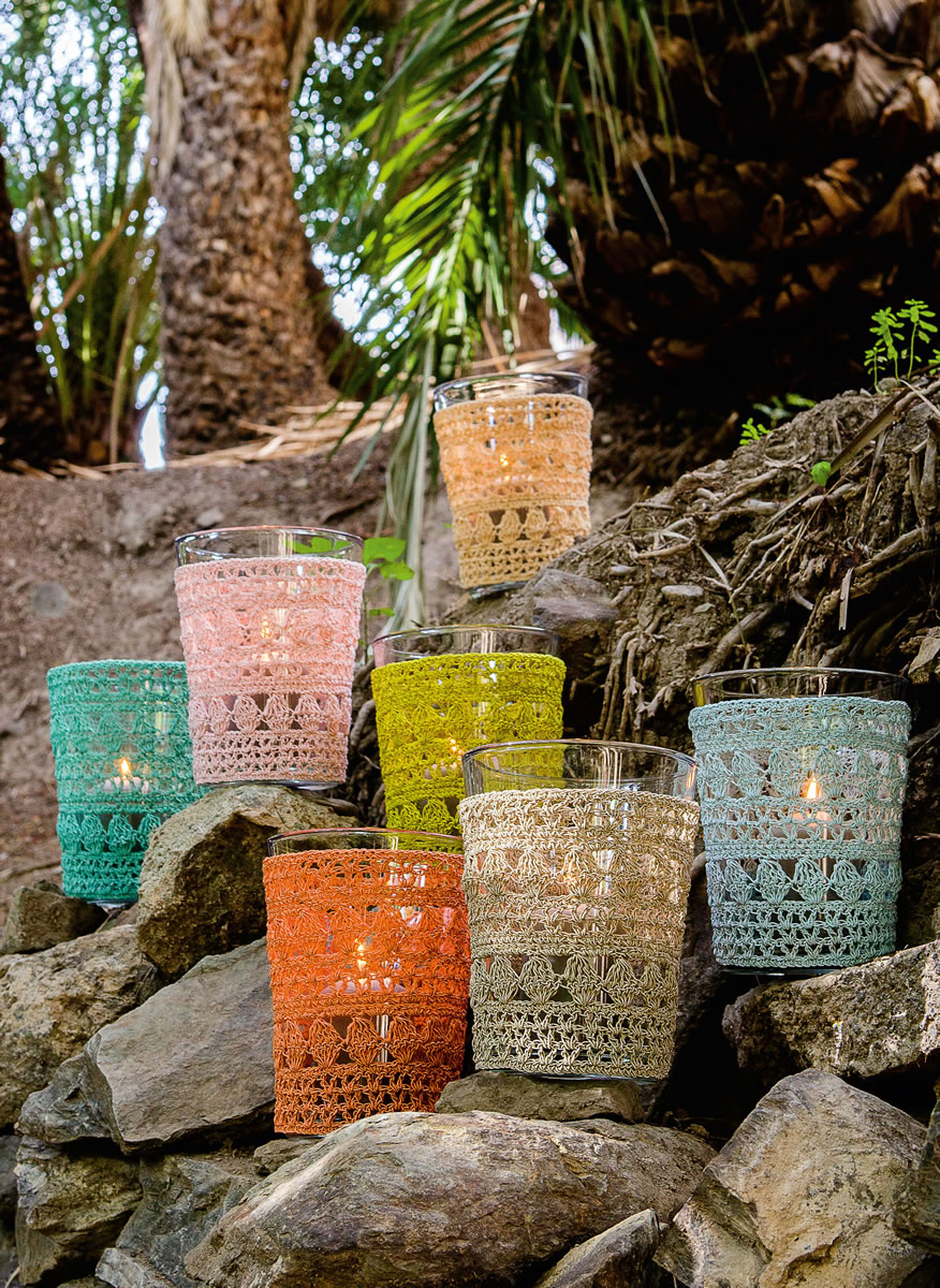 Perfekte til garden-party: Hæklede manchetter i softicefarver til stormlygterne giver herligt blikfang