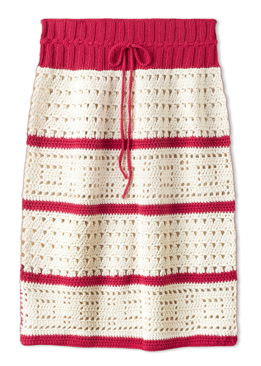 Lana Grossa-kvalitet ”Promessa” (70 % bomuld (økologisk), 30 % polyamid (genanvendt), løbelængde ca. 125 m/50 g): ca. 350 (450) g creme (farve 14) og ca. 100 (150) g orientrød (farve 1); hæklenål nr. 5; 1 kort rundpind nr. 3½.