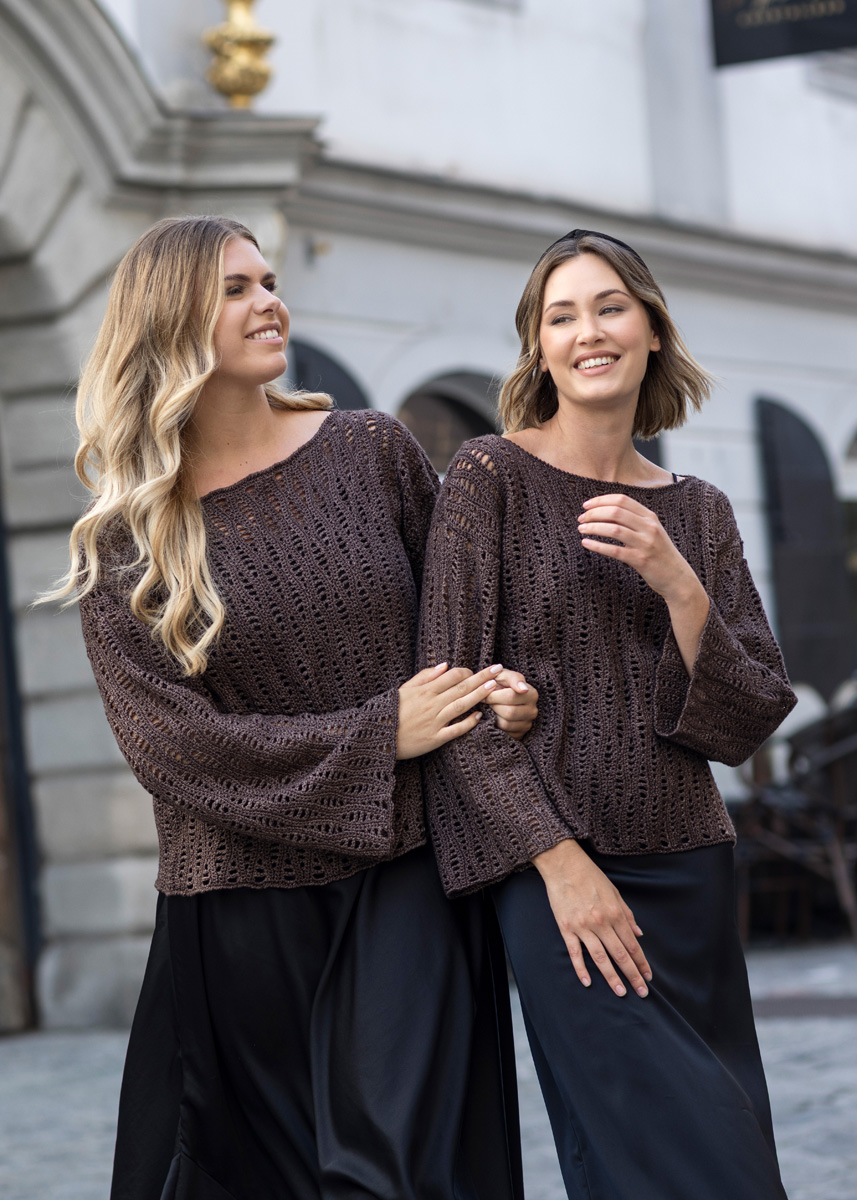 Alle delene af pulloveren hækles på tværs. Modellen har en samlet længde på 55 (55 - 60 - 60 -65 - 65) cm og en brystoverbredde på 8 cm ved 80 cm brystomkreds (12 cm ved 88 cm brystomkreds - 10 cm ved 96 cm brystomkreds - 8 cm ved 104 cm brystomkreds - 10 cm ved 116 cm brystomkreds - 12 cm ved 128 cm brystomkreds).