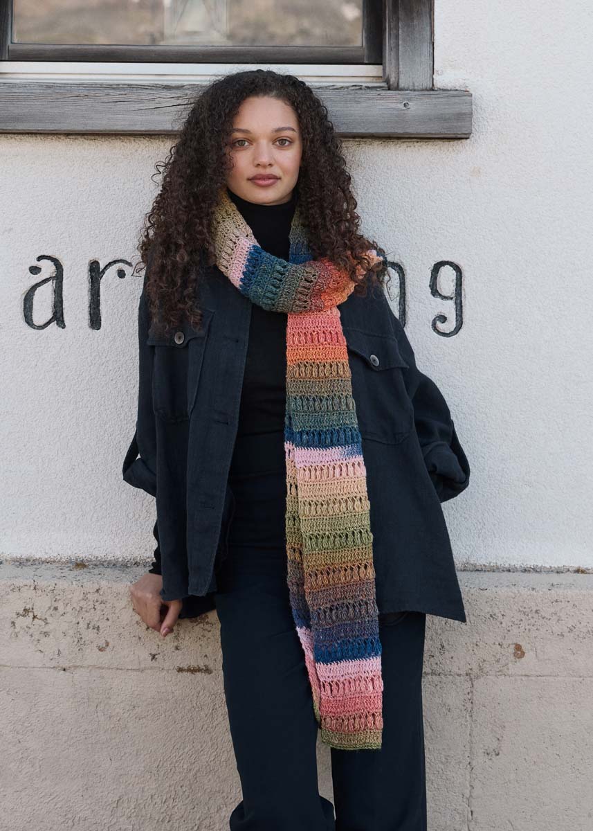 Lana Grossa-kvalitet „Gomitolo Fumo“ (50 % ren ny ull, 50 % polyacryl, løpelengde = ca 700 m/200 g): 1 nøster = ca 200 g mykrosa/aprikos/oransje/gul/grønngrå/oker/petrol (farge 515); heklenål nr. 5.