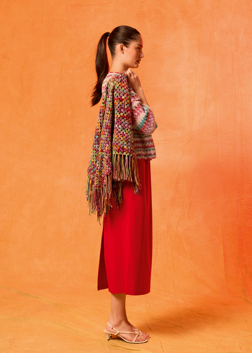 Lana Grossa-kvalitet „Cotonella“ (75 % bomull, 25 % polyacryl, løpelengde = ca 270 m/100 g): ca 3 nøster = ca 300 g aubergine/tyrkis/gul/vårgrønn/rød fargerik(farge 112); 1 heklenål nr. 4,5.
