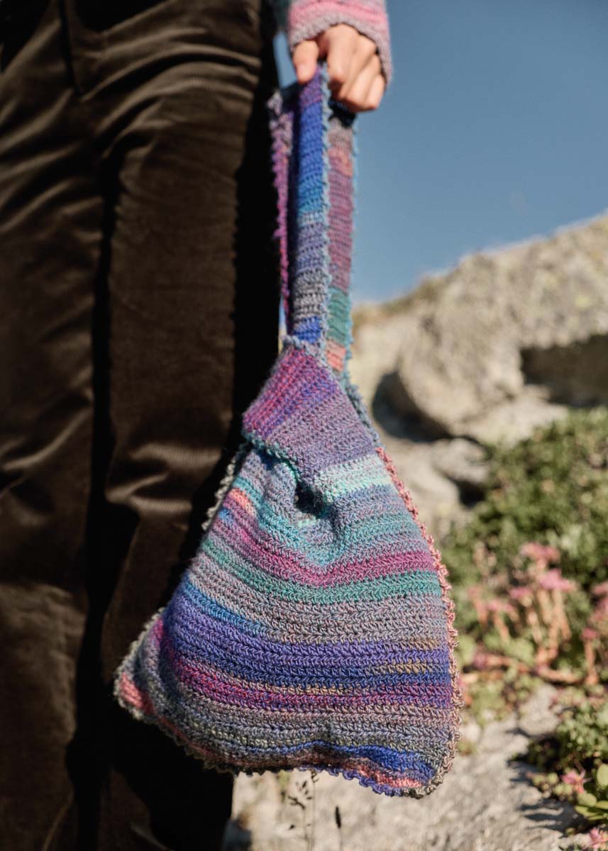 Lana Grossa-kvalitet „Gomitolo Intenso“ (50 % ren ny ull, 50 % polyacryl, løpelengde = ca 700 m/200 g): 1 nøster = ca 200 g mørkgrå/mørkgråblå/gråblå/petrol/rosentre/blåfiolett/grågrønn (farge 231); heklenål nr. 4.