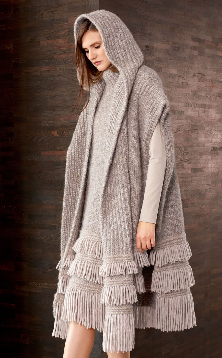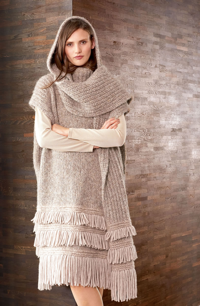Lana Grossa-kvalitet „Garzato Fleece“ (70 % (baby) alpaka, 30 % polyamid, løbelængde = ca. 225 m / 50 gr.): ca. 300 gr natur/beige (fv 23), ”Cloud” (80 % alpaka, 14 % ren ny uld, 6 % polyamid, løbelængde = ca. 80 m / 50 gr.): 50 gr beige (fv 2) og „Alta Moda Superbaby“ (67 % ren ny uld (merino), 30 % (baby) alpaka, 3 % polyamid, løbelængde = ca. 60 m / 50 gr.): ca. 100 gr beige (fv 24), strikkepinde nr. 8, 9 og 10.