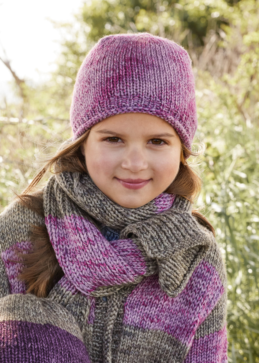 Materiale: Lana Grossa Vintage Chunky (100% ren ny uld (ekstrafin merino), LL = ca. 80 m/50 g) 50 g i gråbeige/lilla (farve 7). Strømpepinde nr. 5 og 6 mm.