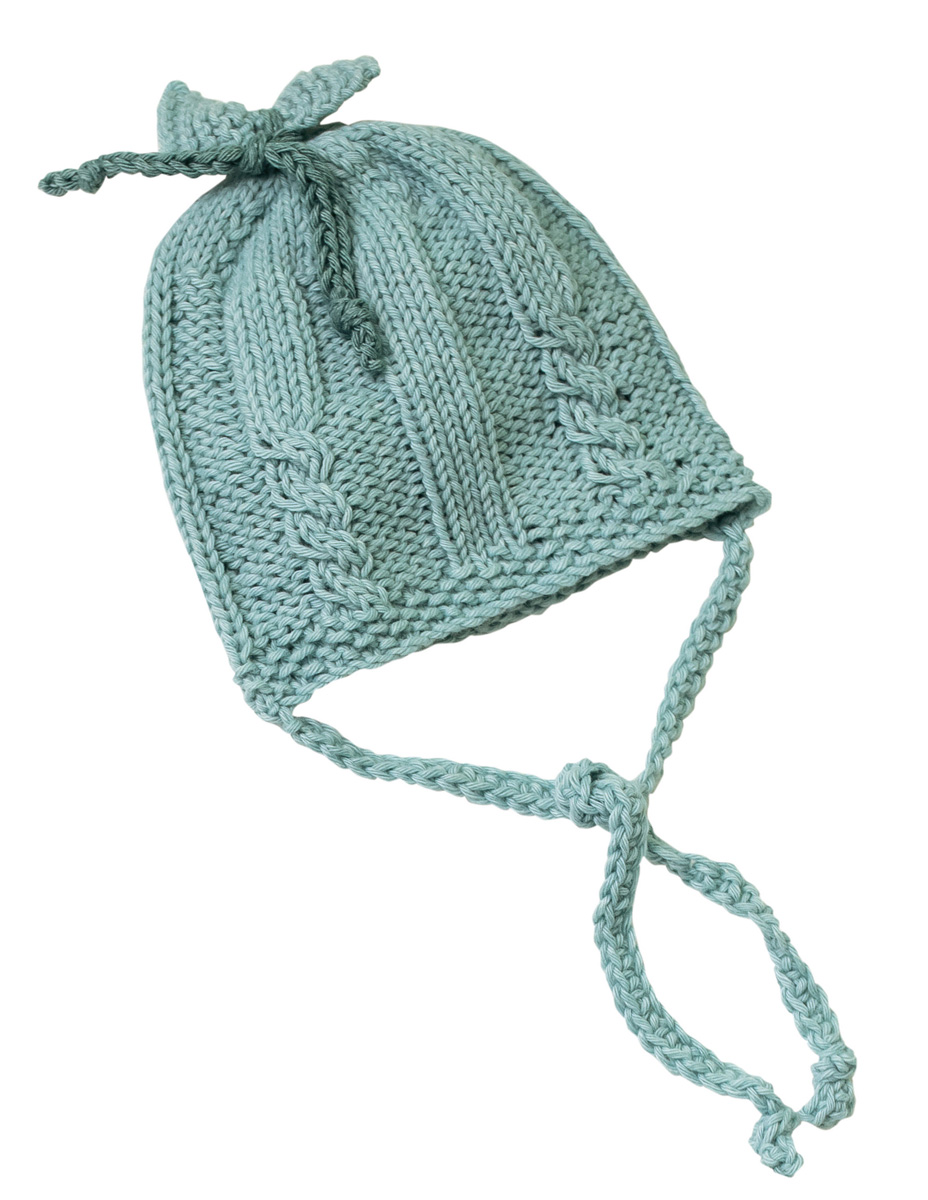 Lana Grossa-kvalitet ”Fourseason” (45 % ren ny uld (ekstrafin merino), 40 % (bio) bomuld, 15 % (rec.) cashmere, løbelængde = ca. 105 m / 50 gr.): ca. 50 gr mint (fv 4) og 50 gr lys petrol (fv 6), strømpepinde nr. 4½, hæklenål nr. 4½.