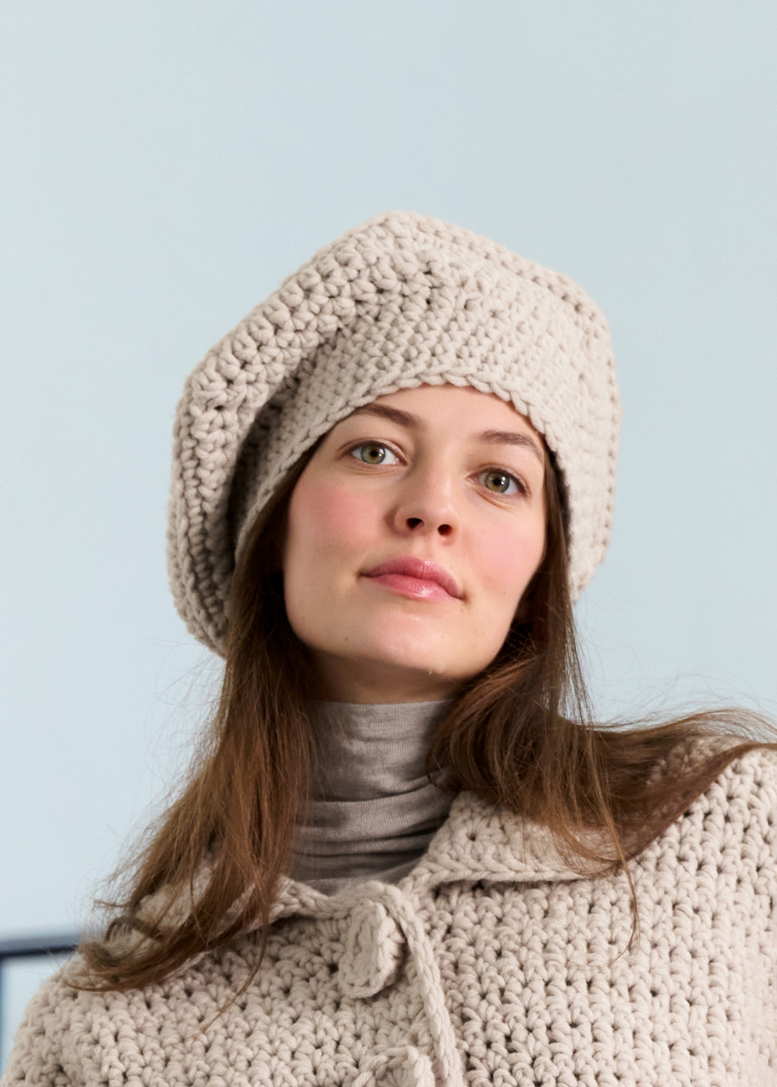 Lana Grossa Mille II (50% ren ny ull (merino ), 50% polyacryl, løpelengde 55 m/50 g), 150 g grège (farge 138); 1 heklenål nr. 8.