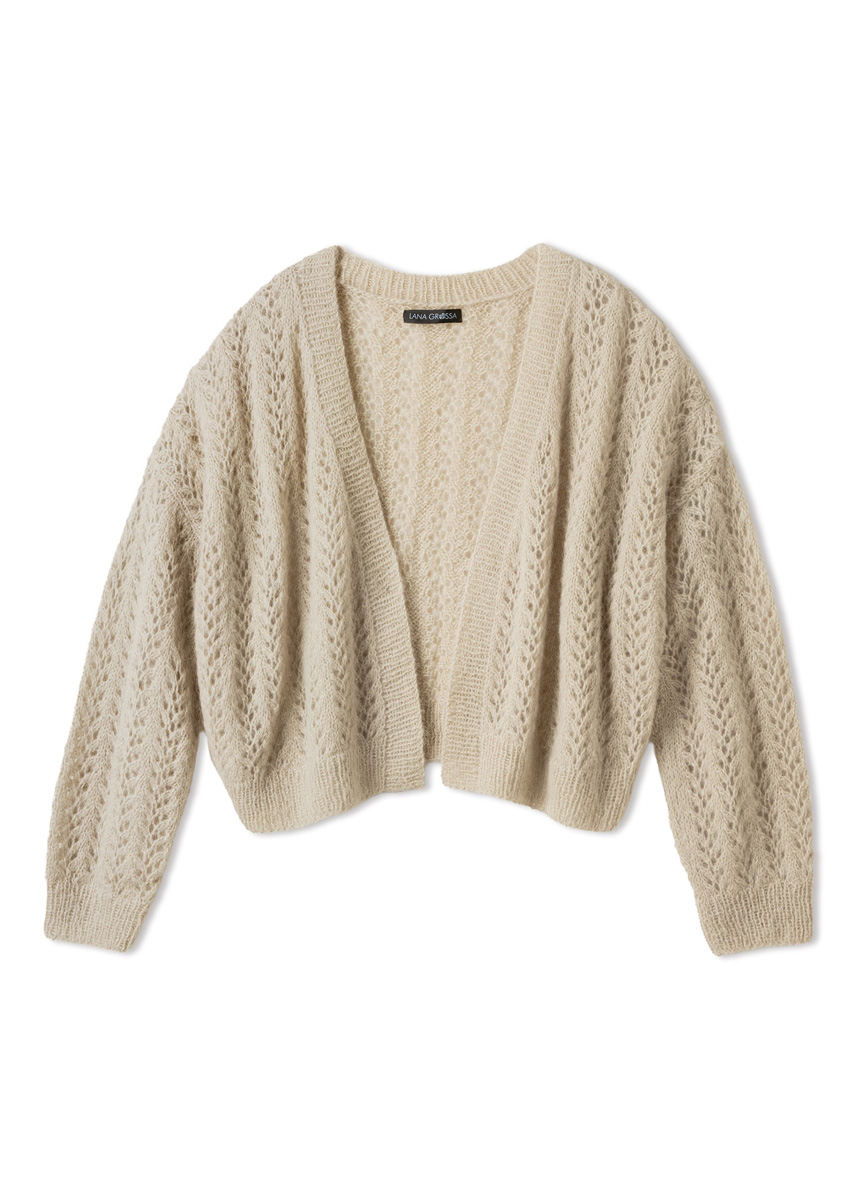 Lana Grossa-kvalitet ”Setasuri” (69 % alpaka (Suri), 31 % silke, løbelængde ca. 212 m/25 g): ca. 250 (250 - 275) g perlebeige (farve 36); strikkepinde nr. 4 og 5; 1 lang rundpind nr. 4.
