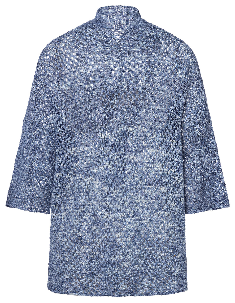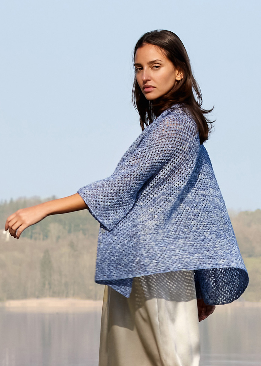 Lana Grossa-kvalitet ”Allora hand-dyed” (76 % bomuld, 14 % ren ny merino (superfin), 10 % (baby) alpaka, løbelængde = ca. 300 m / 50 gr.): 200(250-250) gr Angoor (fv 256), strikkepinde nr. 5, rundpind nr. 4, 120 cm, hæklenål nr. 3½.