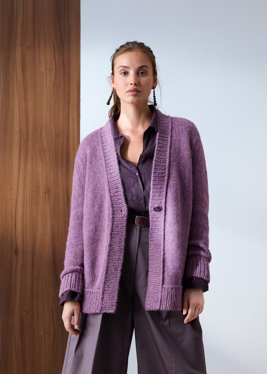 Lana Grossa Brigitte No. 2 (47% alpakka (baby), 45% bomull, 8% ren ny ull (merino ), løpelengde 140 m/ 50 g), 500 (550 – 600 – 650) g mauve (farge 79); strikkepinner nr. 6 og 6,5, 1 rundpinne nr. 6 og 6,5, 100 cm lang, 1 Knopf fra UNION KNOPF, farge dunkles mauve, Ø 22 mm. TIPS: Kun vrangbordkantene og stolpen (lukningskanten) strikkes med dobbel tråd!