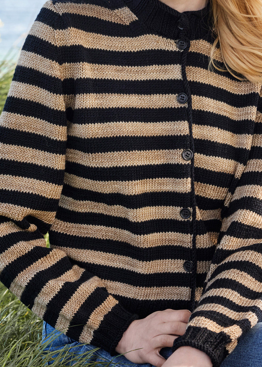 Materiale: Lana Grossa Cool Wool Big (100% ren ny uld (merino), LL = ca. 120 m/50 g), 300 (350 - 350) g i sort (farve 627). Lana Grossa Cool Wool Big Vintage (100% ren ny uld (merino), LL = ca. 120 m/50 g), 200 (250 - 300) g i sandbeige (farve 7182). En rundpind på 60 cm eller 80 cm hver, størrelse 3,5 mm og størrelse 4 mm, 2 MM. 7 knapper, ca. 16 mm i diameter.