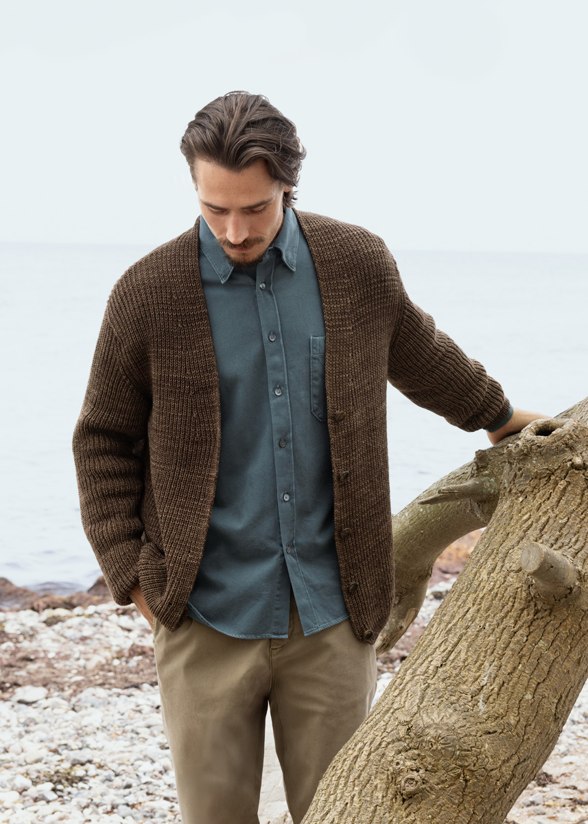 Lana Grossa Cool Wool Vintage (100% ren ny ull (ekstrafin merino), løpelengde 160 m/50 g), 850 (950 – 1050) g mørkbrun (farge 7384); strikkepinner nr. 3 og 3,5, såvel som 5 knapper fra UNION KNOPF, Art. 39970, farge 201, Ø 23 mm.