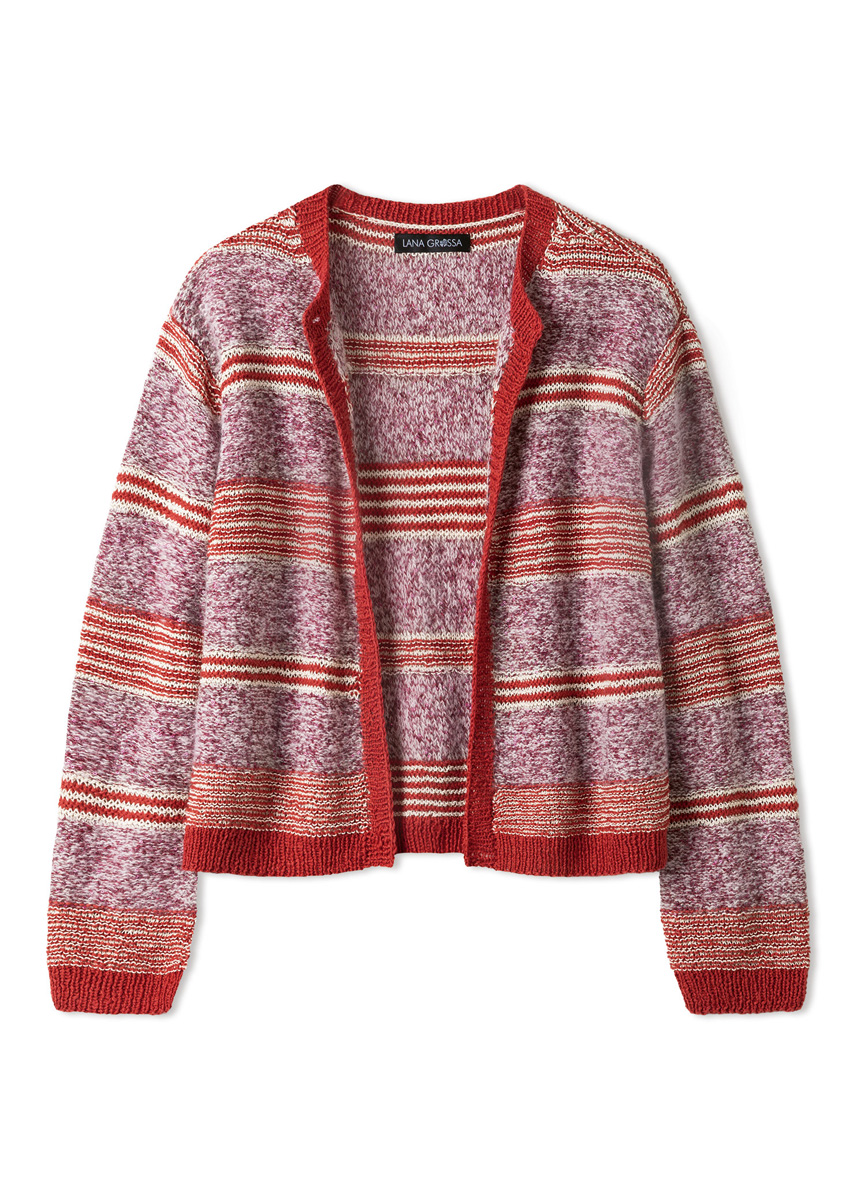 Lana Grossa-kvalitet ”Summer Cashmere” (90 % bomuld, 10 % kashmir, løbelængde ca. 210 m/50 g): ca. 100 (150 - 150 - 200) g orientrød (farve 25); Lana Grossa-kvalitet ”Setasuri” (69 % alpaka (Suri), 31 % silke, løbelængde ca. 212 m/25 g): ca. 75 (100 - 100 - 125) g creme (farve 2); Lana Grossa-kvalitet ”Filo Lurex” (94 % bomuld, 6 % polyester, løbelængde ca. 145 m/50 g): ca. 100 (100 - 150 - 150) g creme (farve 2); Lana Grossa-kvalitet ”Glamour” (55 % polyamid, 45 % polyester, løbelængde ca. 115 m/25 g): ca. 125 (125 - 150 - 150) g bordeaux (farve 9); Strikkepinde nr. 3 og 4; 1 rundpind nr. 3.