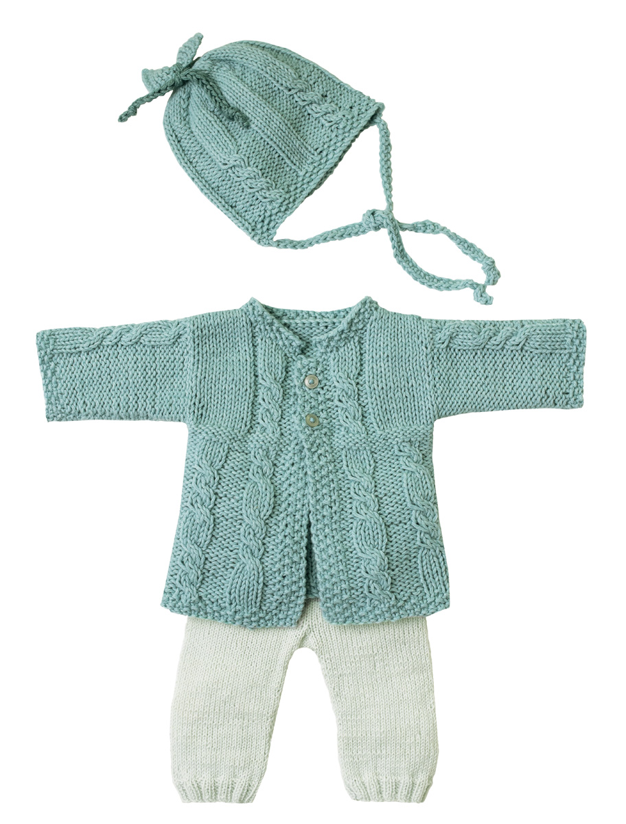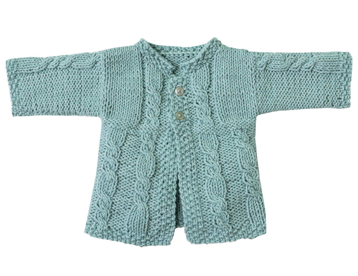 Lana Grossa-kvalitet ”Fourseason” (45 % ren ny uld (ekstrafin merino), 40 % (bio) bomuld, 15 % (rec.) cashmere, løbelængde = ca. 105 m / 50 gr.): ca. 100(100-150) gr mint (fv 4), strikkepinde nr. 4½, rundpind nr. 4½, 40 cm, 2 knapper 12 mm Ø.