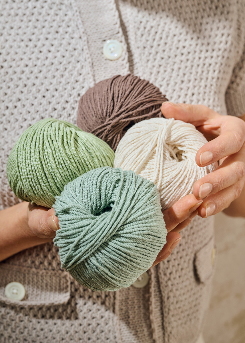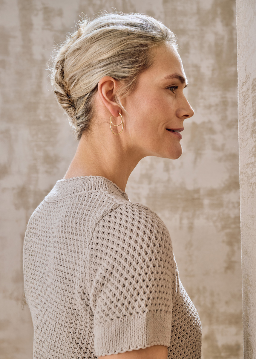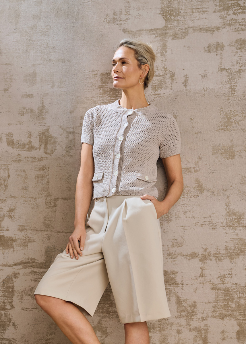 Lana Grossa-Kvalitet Gioia (75% bomuld, 25% genanvendt polyamid, løbelængde 110 m/50 g), 400 (450 – 500) g beige (farve 16); strikkepinde nr. 4½ og 5, 8 knapper fra UNION KNOPF, art. 18001, farve 99, 20 mm Ø.