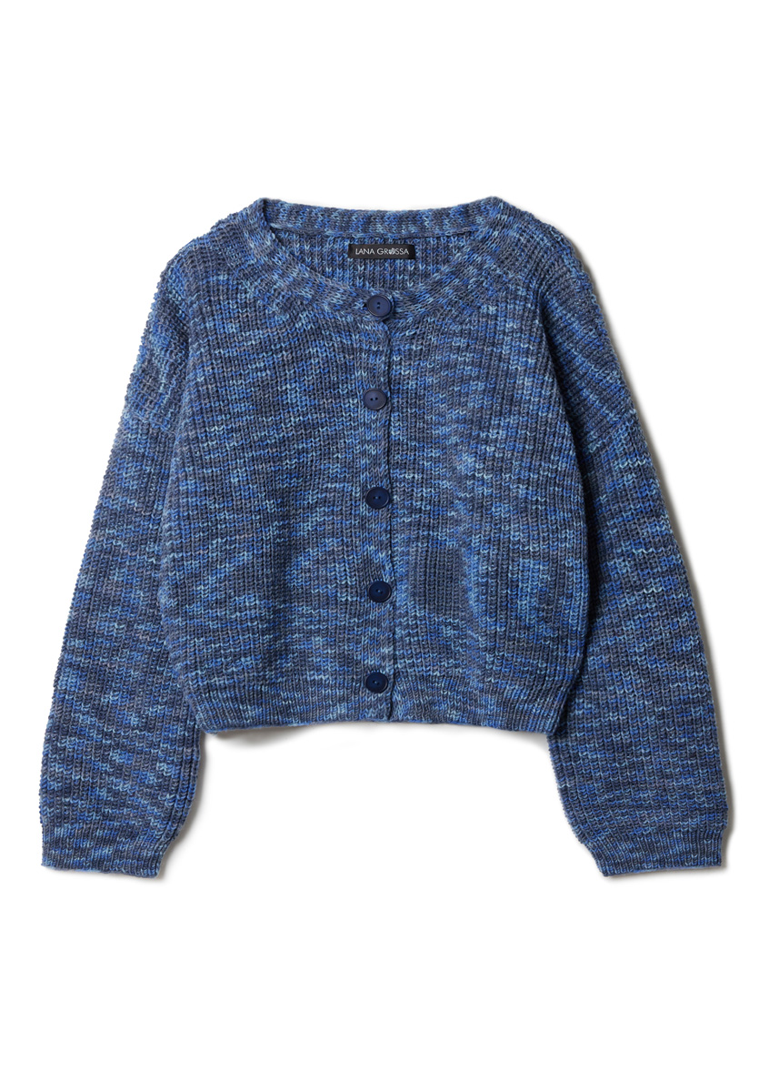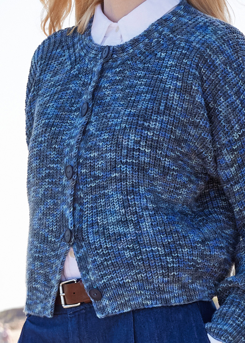 Materiale: Lana Grossa Cool Wool Print (100% ren ny uld (merino), LL = ca. 160 m/50 g), 700 (750 - 800 - 850) g i jeans/gråblå/ royal (farve 716). Strikkepinde nr. 3 og 3,5mm. Fem knapper, ca. 24 mm i diameter.