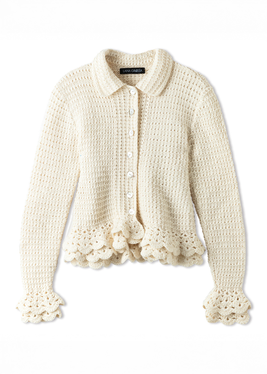 Lana Grossa-kvalitet ”Summer Softness” (80 % (økologisk) bomuld, 20 % ren ny uld (merino superfine), løbelængde ca. 130 m/50 g): ca. 500 (550 - 600 - 650) g cremefarvet (farve 2), strikkepinde nr. 4½, hæklenål nr. 6, 7 perlemorsknapper, 20 mm Ø