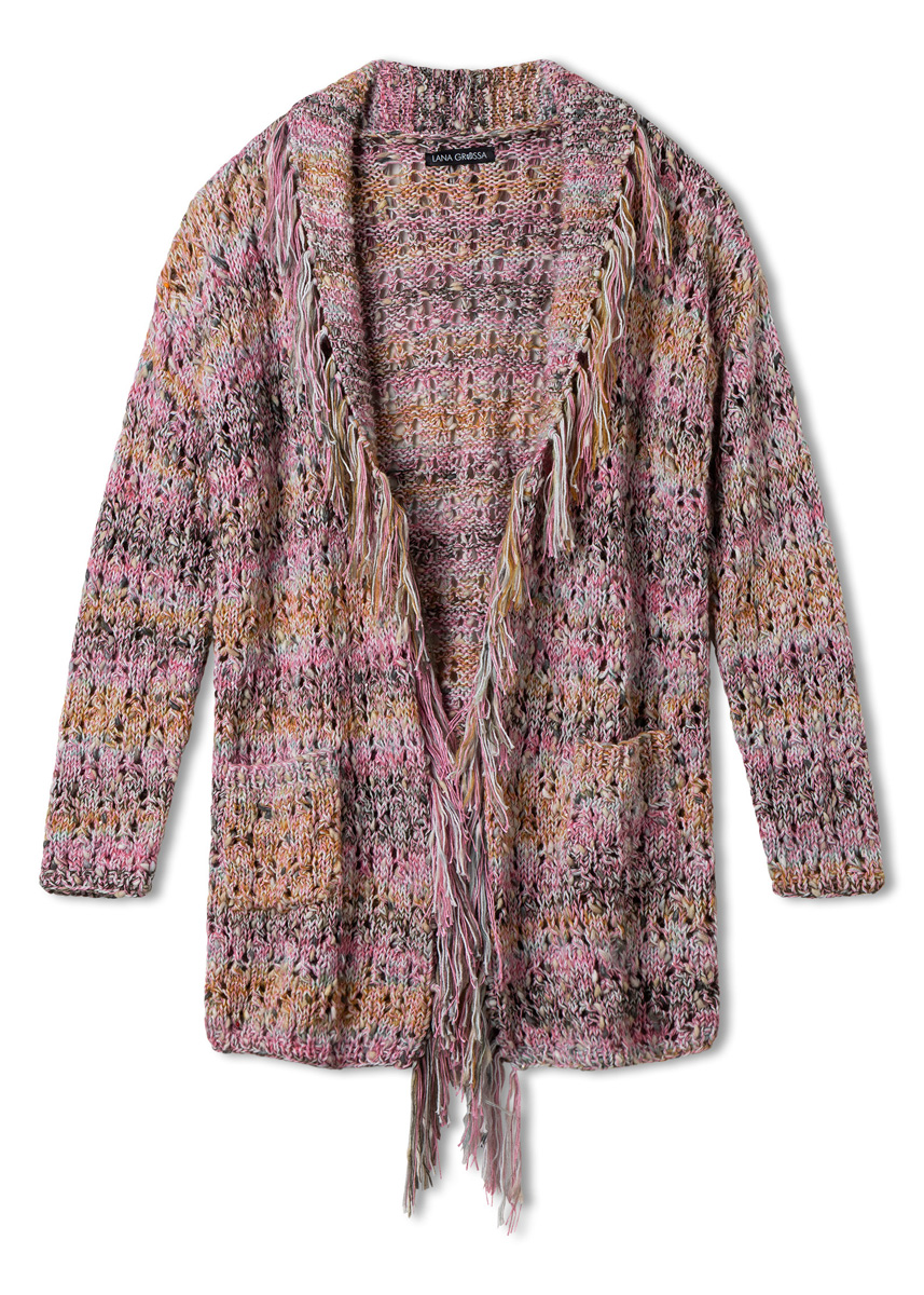 Lana Grossa Cottonhair (70% Mohair (Superkid), 30% bomull, løpelengde = ca. 450 m/50 g), 100 (150 - 150) g i sennep/gammelrosa/mudder/mintturkis/oker (farge 109). Lana Grossa Filo Paillettes (55% bomull, 39% polyester, 6% polyamid, løpelengde = ca. 155 m/50 g), 300 (300 - 350) g i rosa (farge 7). Lana Grossa Popcorn (100% bomull, løpelengde = ca. 125 m/50 g), 650 (700 - 750) g i sølvgrå/beige/grå/mørkgrå (farge 10). strikkepinner nr. 6. 1 heklenål til frynser; 2 hjelpepinner til hvilende m.