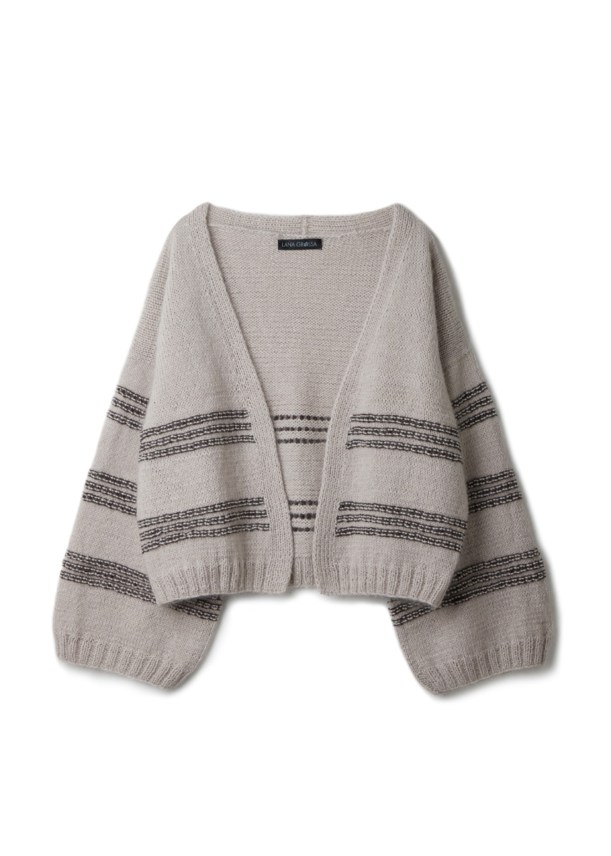 Materiale: Lana Grossa Silkhair (70% mohair (superkid), 30% silke, LL = ca. 210 m/25 g). 150 (175 - 200) g i lys beige (farve 18), Lana Grossa Merino Superiore (100% ren ny uld (ekstrafin merino), LL = ca. 180 m/50 g), 300 (350 - 400) g i gråbeige (farve 4), Lana Grossa Cool Wool (100% ren ny uld (ekstrafin merino), LL = ca. 160 m/50 g), 50 (50 - 100) g i sortbrun (farve 2113). En 80 cm lang rundpind 4 mm. 2 hjælpepinde. Bemærk: 1 tråd Silkhair + 1 tråd Merino Superiore strikkes sammen.