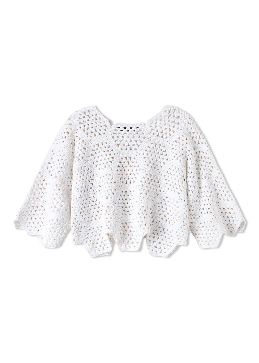 Lana Grossa-kvalitet ”Promessa” (70 % bomuld (økologisk), 30 % polyamid (genanvendt), løbelængde = ca. 125 m/50 g): 550 (700) g hvid (farve 13); hæklenål nr. 4.