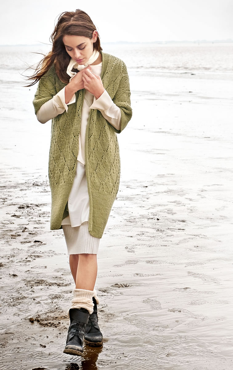 Lana Grossa-kvalitet ”Cool Wool Alpaca” (70 % ren ny uld, 30 % alpaka, løbelængde = ca. 140 m / 50 gr.): ca. 600(700) gr. høgrøn (fv 29), strikkepinde nr. 4, rundpind nr. 4, 100 cm
