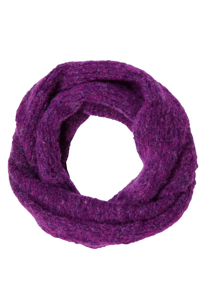 Lana Grossa-kvalitet „Garzato Fleece“ (70 % (baby) alpaka, 30 % polyamid, løbelængde = ca. 225 m / 50 gr.): ca. 50 gr lilla/sort (fv 7). Strikkepinde nr. 4½ og 5½, rundpind nr. 4½, 40 cm.