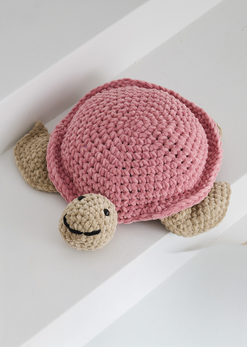 Lana Grossa The Look (100% polyester; løpelengde = 120 m/100 g): hver 100 g gammelrosa (farge 4), beige (farge 23), nougat (farge 12) og svart (farge 13); 1 heklenål nr. 7; sikkerhetsøyne med 12 mm Ø; bomullsstoff (fast vevd stoff), ca. 30 cm x 60 cm; fyllvatt. Merknad: Den angitte mengden rekker til én mellomstor og én liten skilpadde.