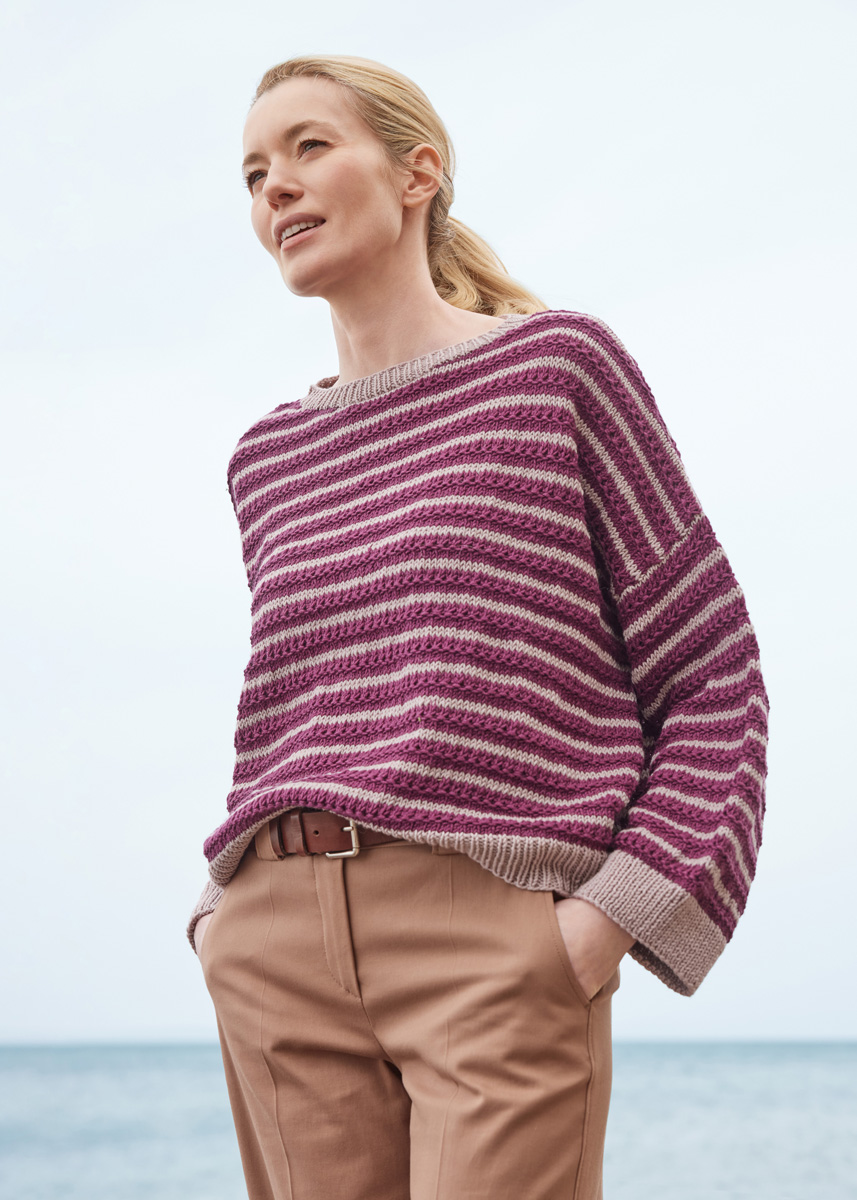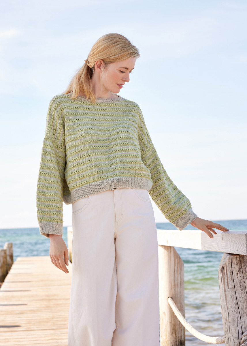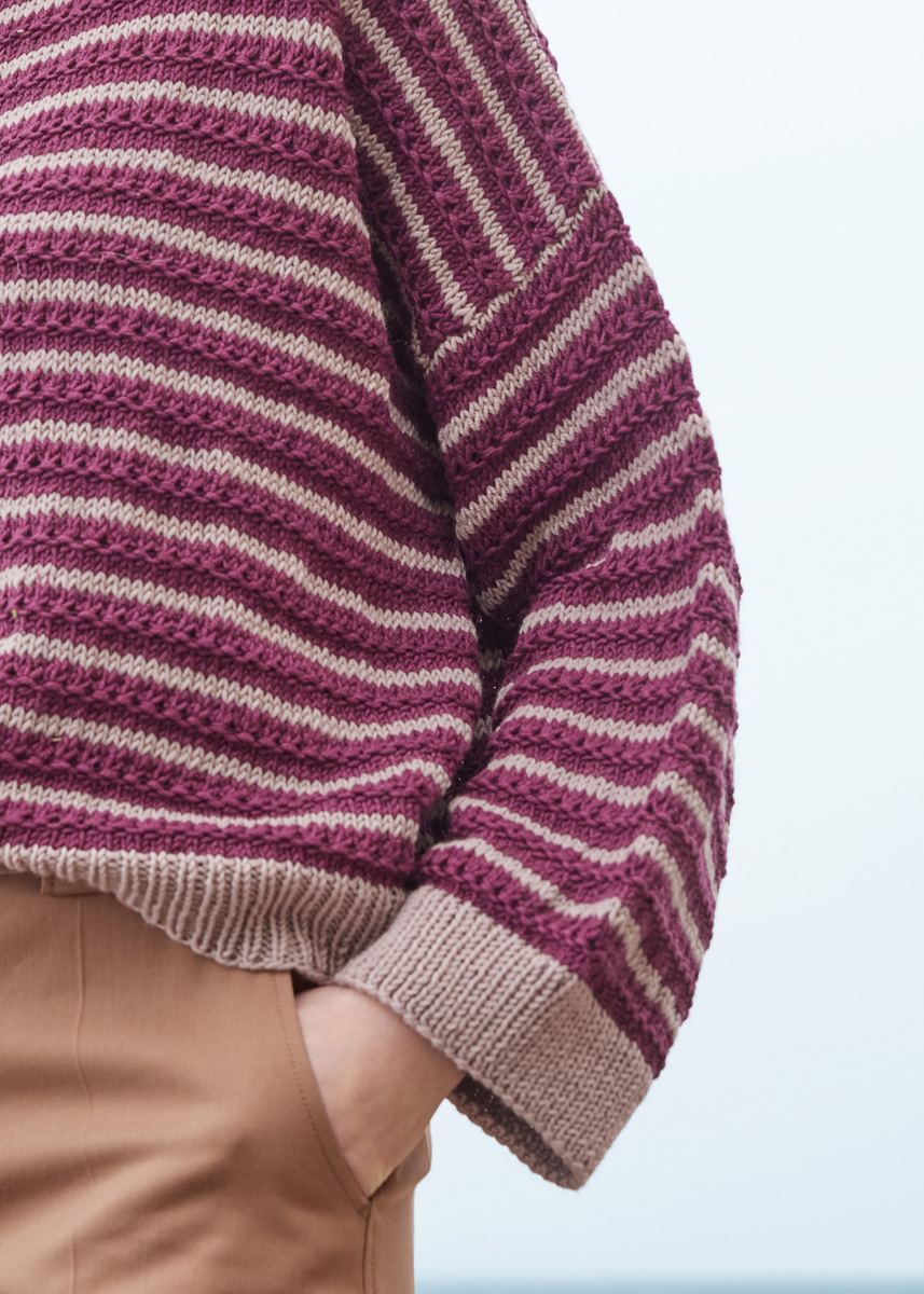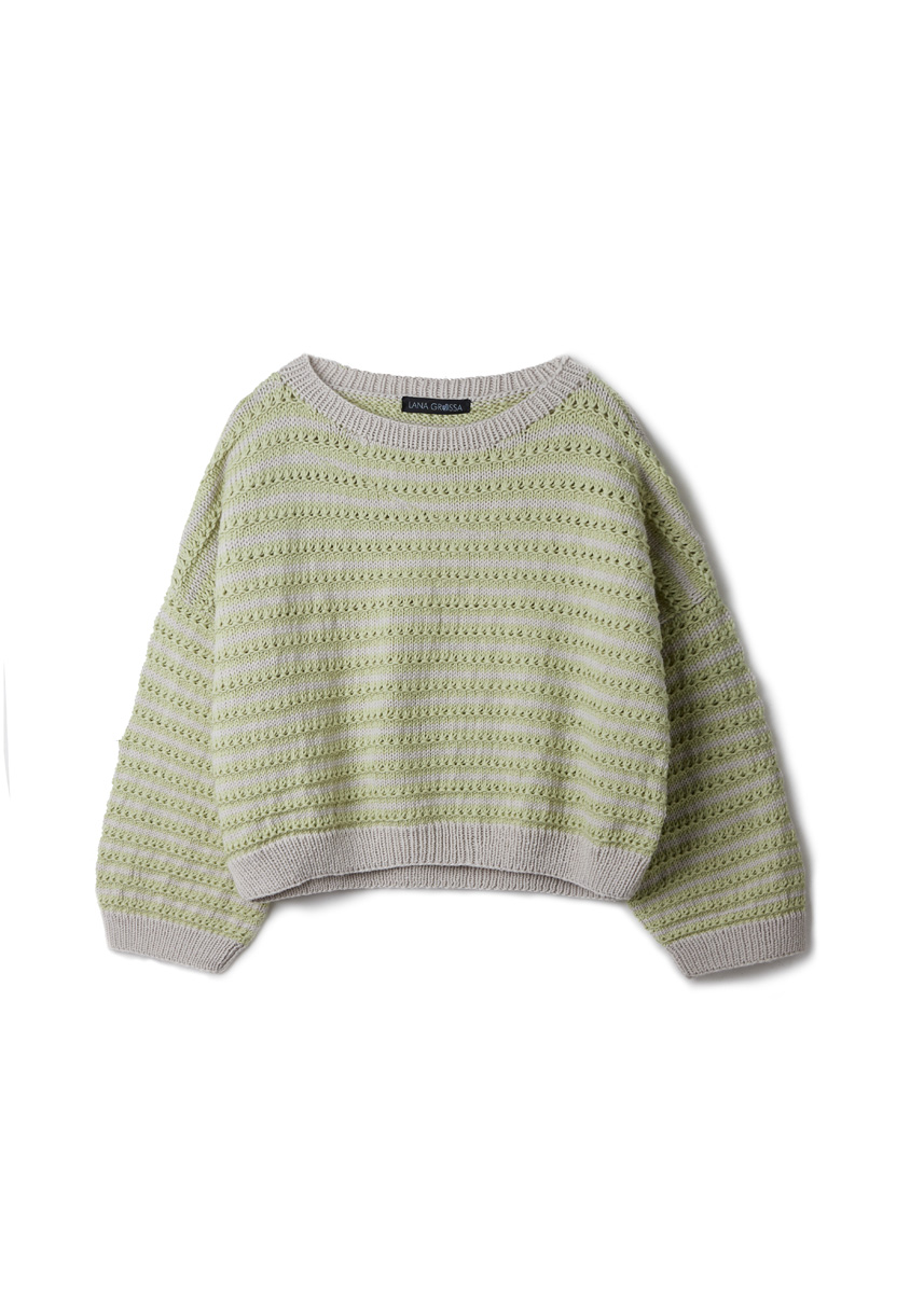 VARIANT 1 Materiale: Lana Grossa Cool Wool Big (100% ren ny uld ( merino), LL = ca. 120 m/50 g), 400 (400 - 450 - 450) g i gråbeige (farve 1010) og 250 (250 - 300 - 300) g i birkegrøn (farve 1029). Strikkepinde nr. 4 og 5 mm og en 50 cm lang rundpind nr. 5 mm.