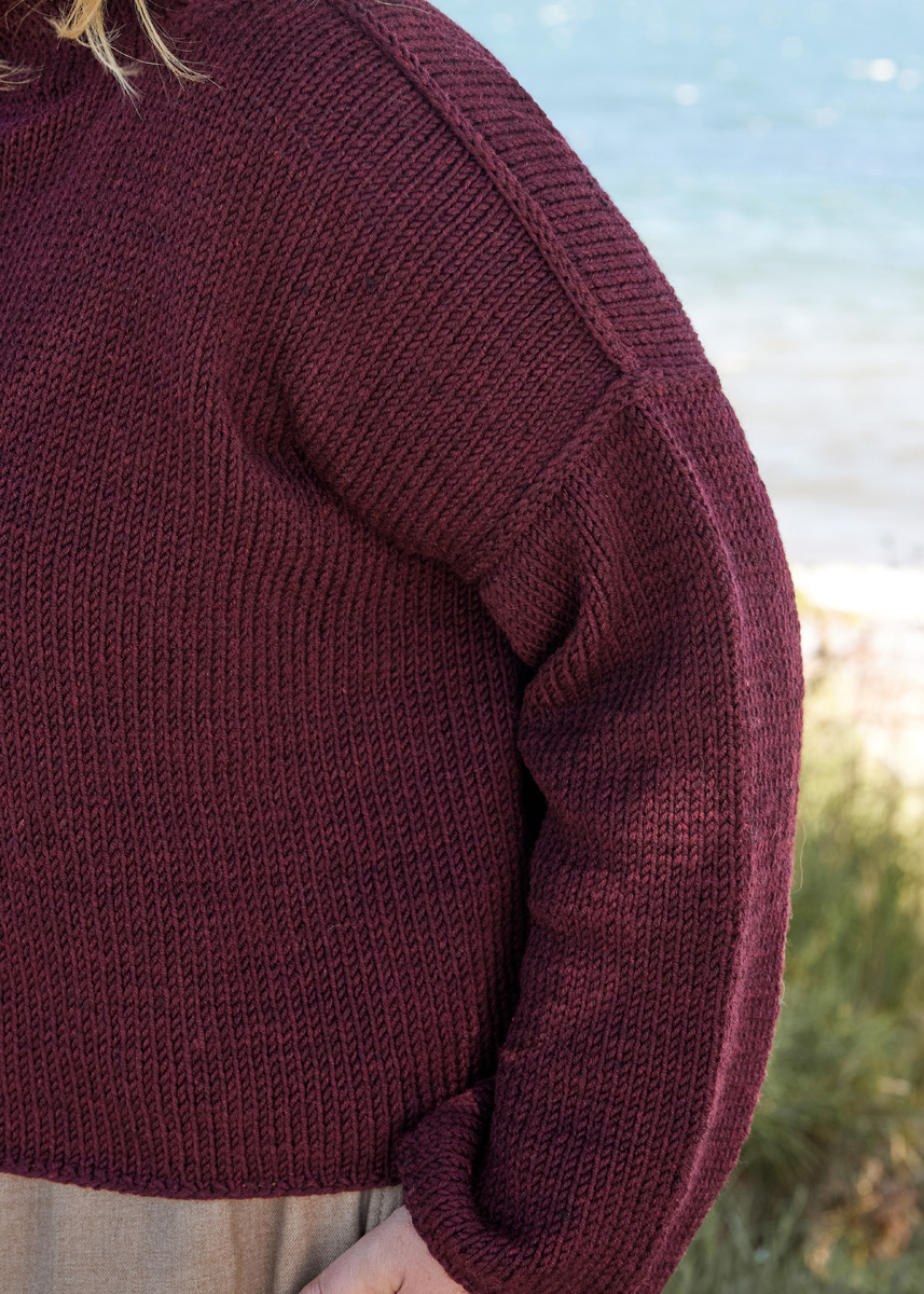 Materiale: Lana Grossa Cool Wool Superbig Mélange (100% ren ny uld (merino), LL = ca. 80 m/50 g), 550 (600 - 650 - 700 - 750) g i burgunder melange (farve 203). Strikkepinde nr. 5 og 6 mm. 1 hjælpepind som maskeholder.