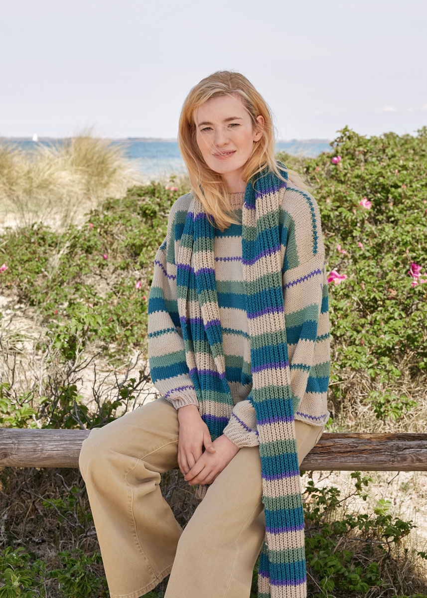 Materiale: Lana Grossa Merino Uno (100% ren ny uld (merino), LL = ca. 125 m/50 g), 300 (350 - 350 - 400) g i gråbeige (farve 55), 100 (100 - 150 - 150) g i petrol (farve 60), 100 (100 - 100 - 150) g i resedagrøn (farve 34), 50 g i violet (farve 86). Strikkepinde nr. 4,5 og 5, og en 50 cm lang rundpind nr. 4,5.