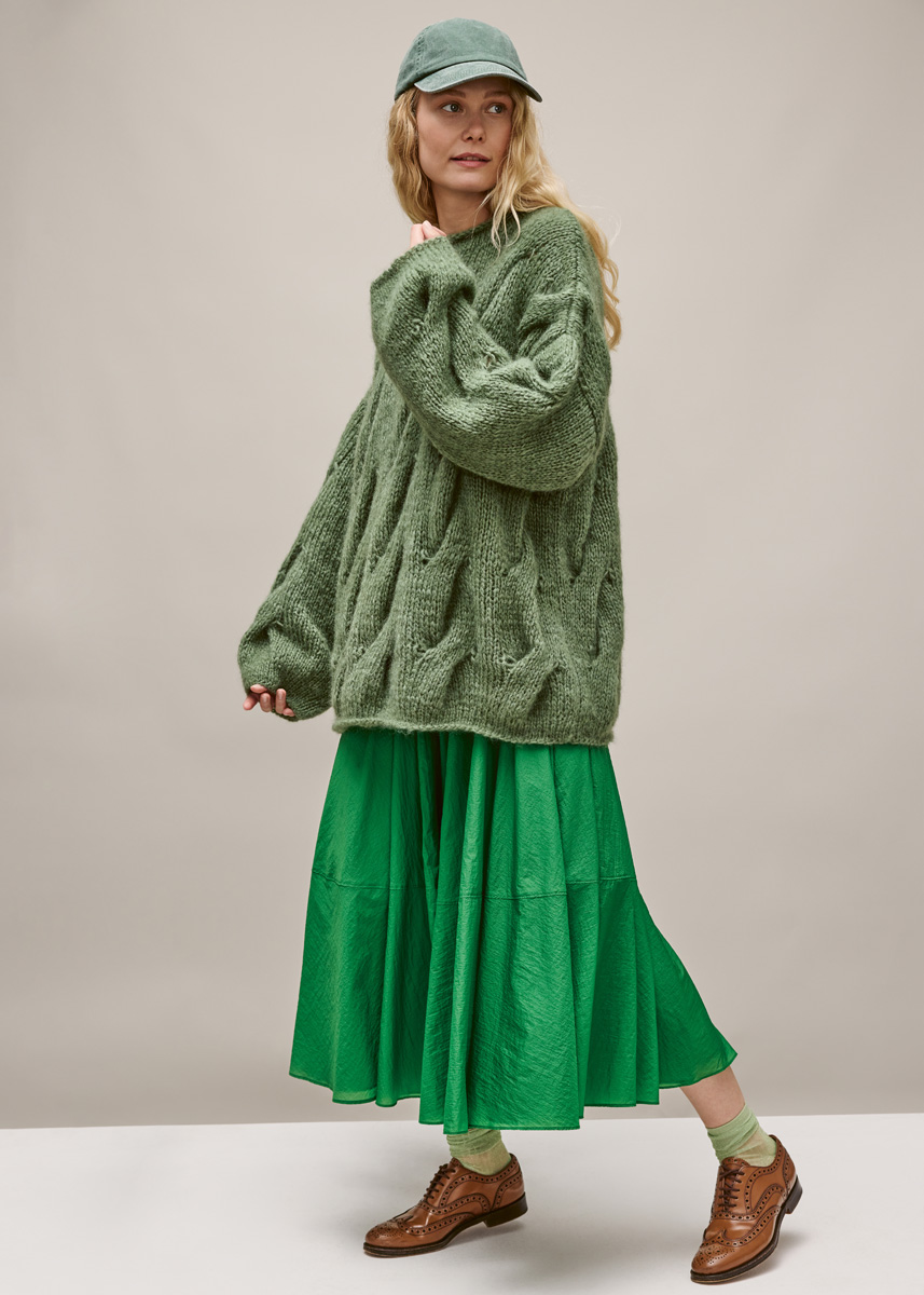 Lana Grossa Mohair di Gio (55 % mohair (superkid), 45 % uld (merino superfine), løbelængde = 85 m / 50 g): 600 (650 / 700 / 750) g resedagrøn (fv 13); rundpinde nr. 6 og 7, 80- 100 cm, rundpind nr. 6, 40 cm (udelades, hvis der strikkes med Magic Loop-metoden), 1 hjælpepind til snoninger.