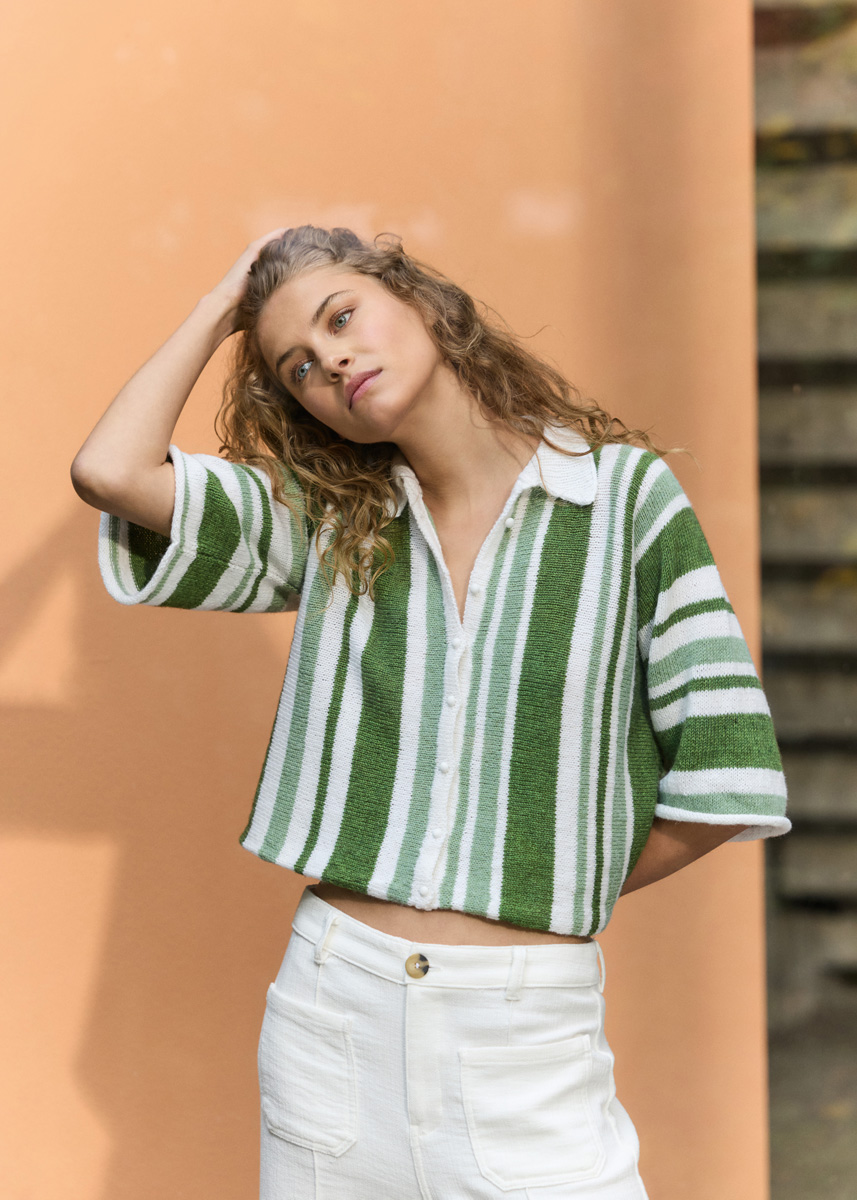 Lana Grossa-kvalitet „Ecopuno“ (72 % bomull, 17 % ren ny ull (merino), 11 % alpakka (Baby), løpelengde = ca 215 m/50 g): ca 50 (100 - 100 - 100) g resedagrønn (farge 20), ca 150 (200 - 200 - 250) g hvit (farge 26) og ca 100 (150 - 150 - 200) g gressgrønn (farge 221); pinner nr. 3 og nr. 3,5; heklenål nr. 3,5; 7 hvite knapper, diameter 10 mm.