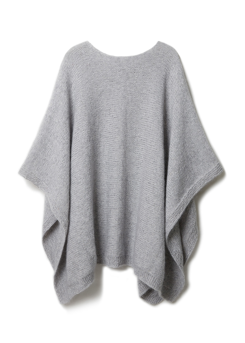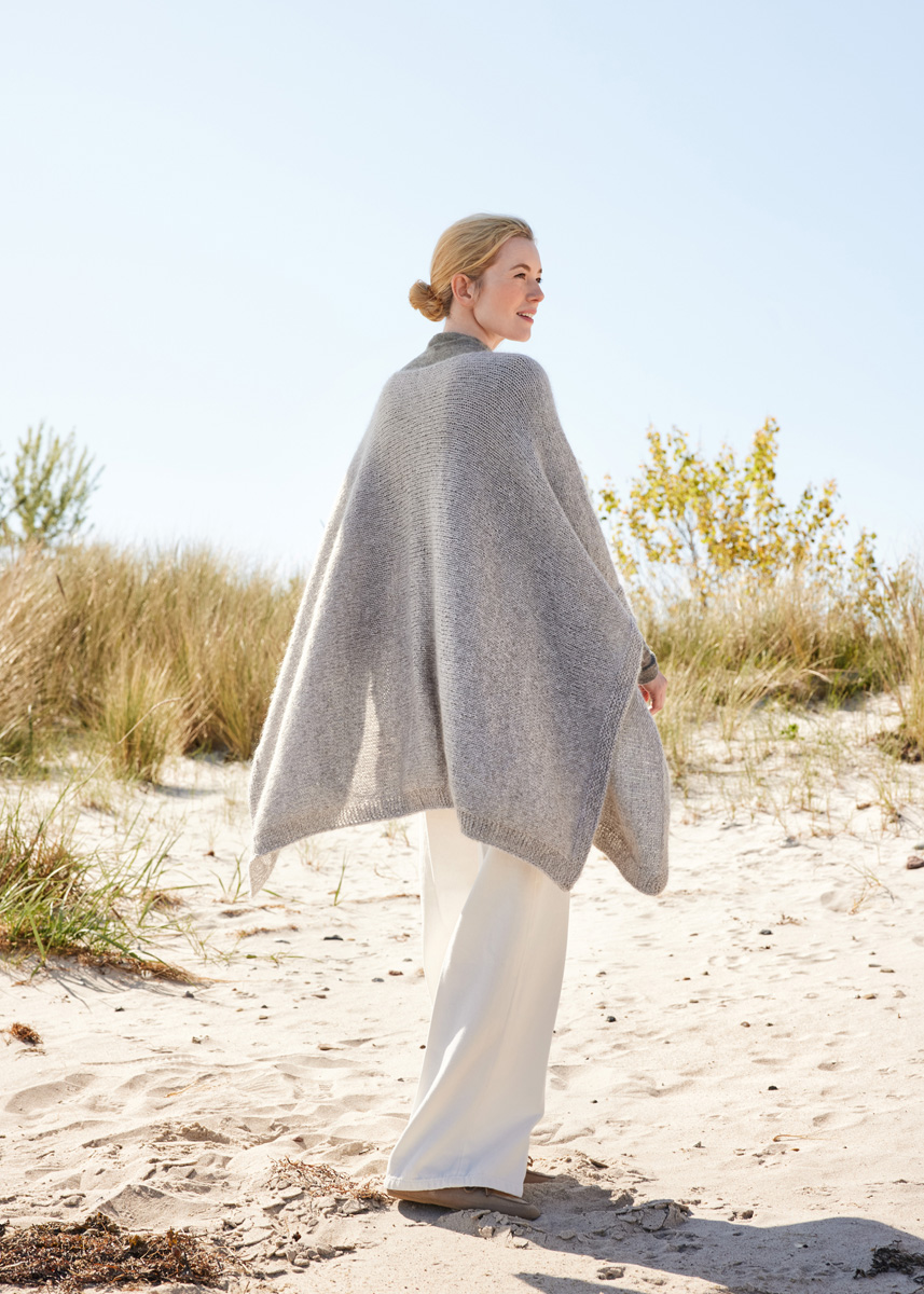 Materiale: Lana Grossa Landlust Soft Tweed 180 (100% ren ny uld (merino), LL = ca. 180 m/50 g), 400 (500) g i sølvgrå melange (farve 125). Lana Grossa Silkhair (70% mohair (superkid), 30% silke, ca. 210 m/25 g) 200 (250) g i grafitgrå (farve 94). Strikkepinde nr. 6. 2 hjælpepinde til at holde masker. Bemærk: Strik med 1 tråd Landlust Soft Tweed 180 og 1 tråd Silkhair sammen.