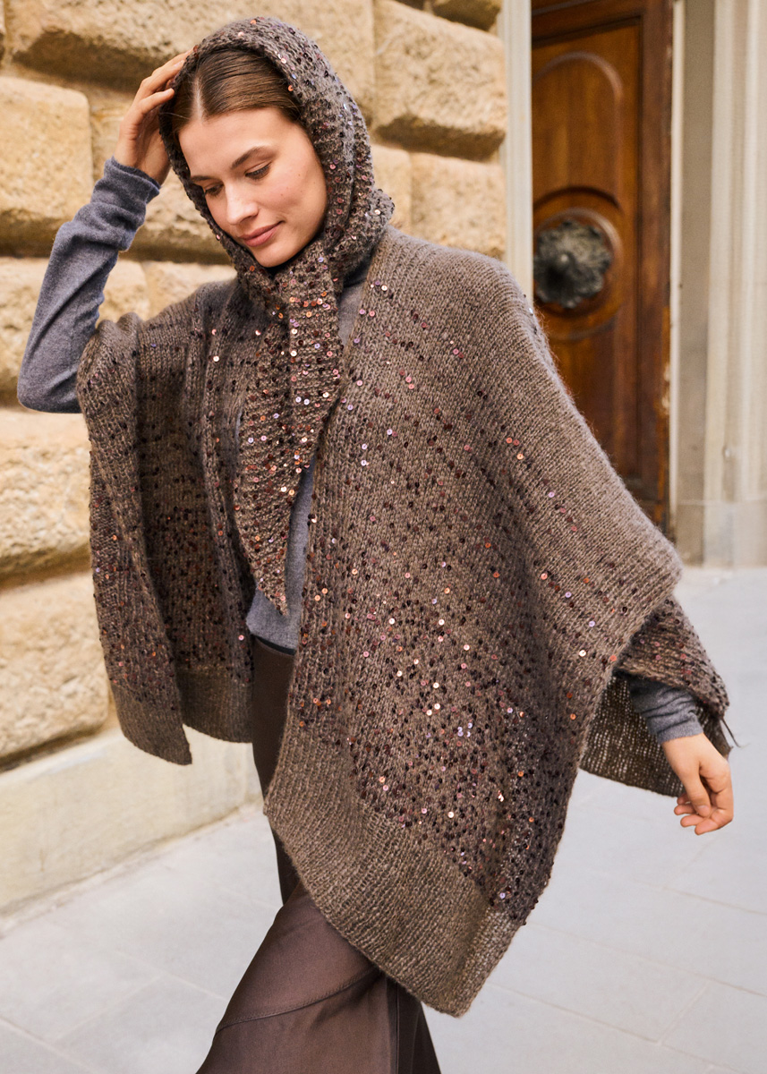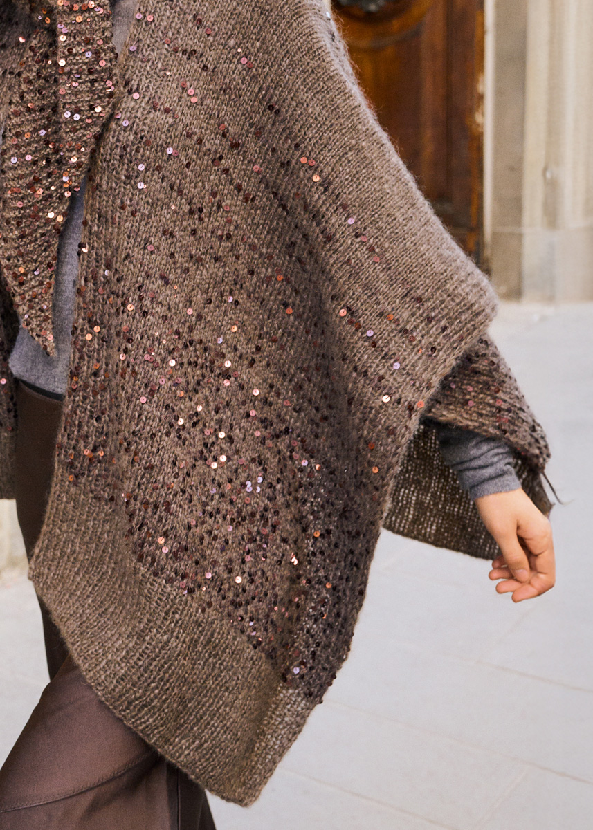 Lana Grossa-kvalitet ”Superkid Seta” (65% mohair (superkid), 35% silke, løbelængde = ca. 100 m / 25 gr.): ca. 275 gr gråbrun (fv 26) og Lana Grossa-kvalitet ”Cosmo” (100% bomuld (+ pailletter), løbelængde = ca. 260 m / 100 gr.): ca. 200 gr mokka (fv 6), strikkepinde nr. 6. Ponchoen strikkes med dobbelt garn = 1 tråd af hver kvalitet.