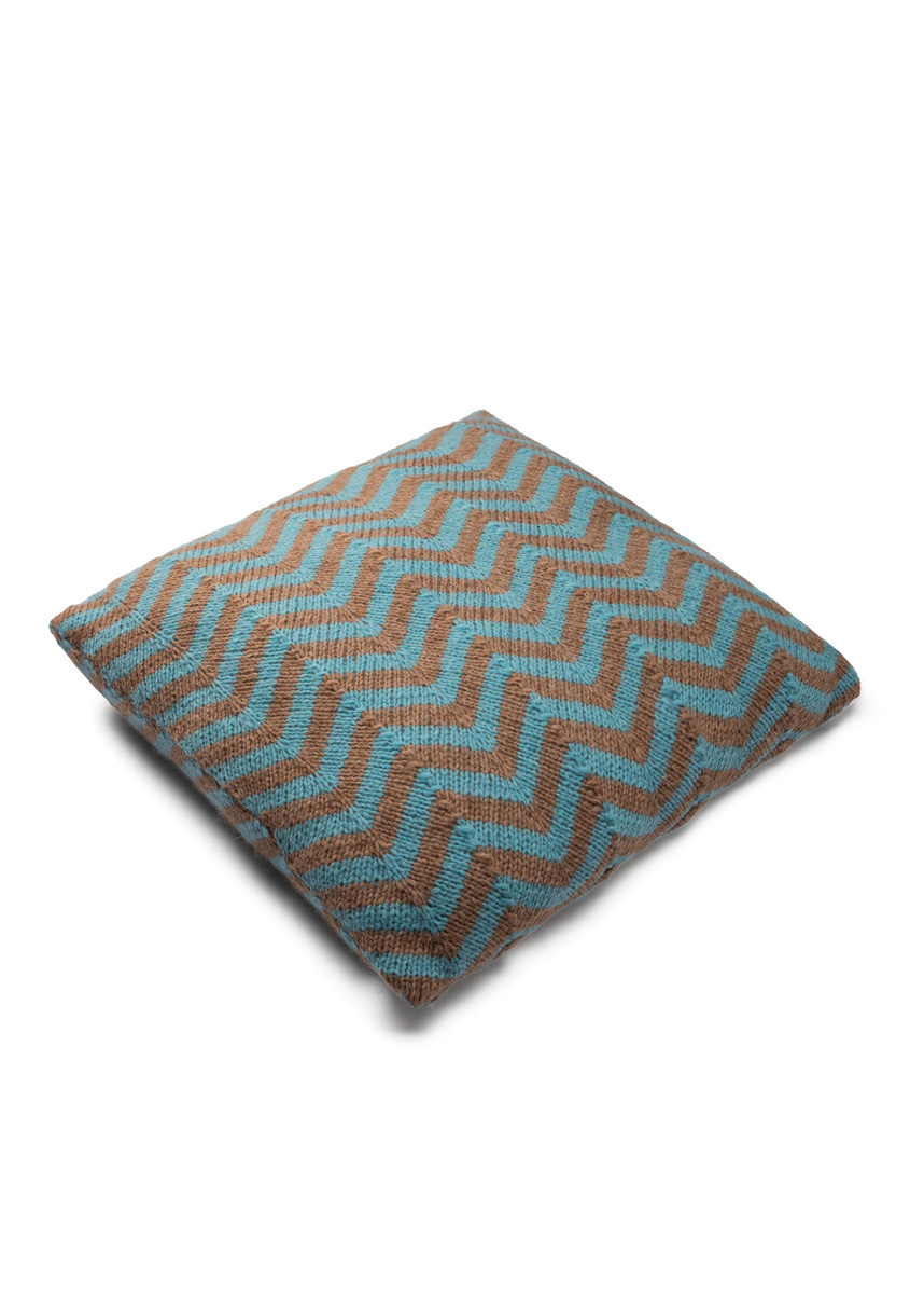 Lana Grossa-kvalitet „Brigitte No. 2” (47 % (baby) alpakka, 45 % bomull, 8 % ren ny ull (merino), løpelengde = ca. 140 m/50 g): hver ca. 100 g turkisblå (farge 77) og rosentre (farge 43); pinner nr. 5; 1 vaskbart puteinnlegg, 50 x 50 cm